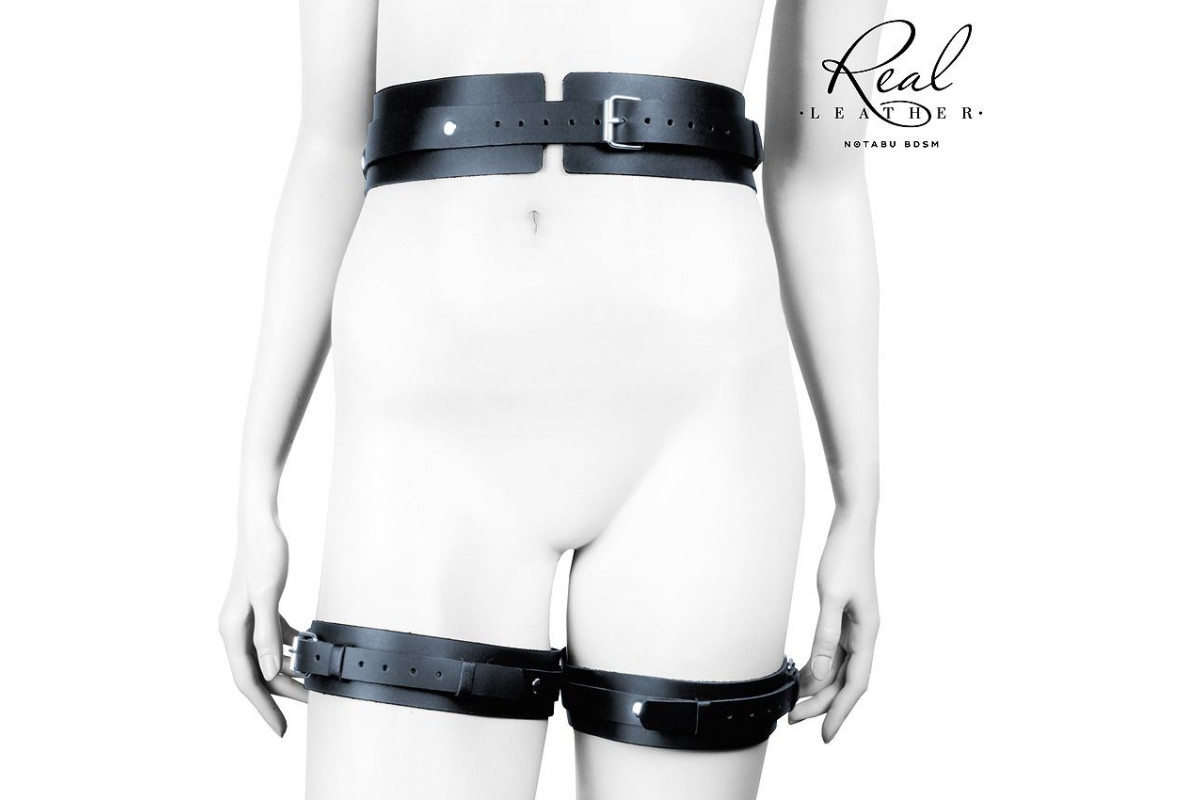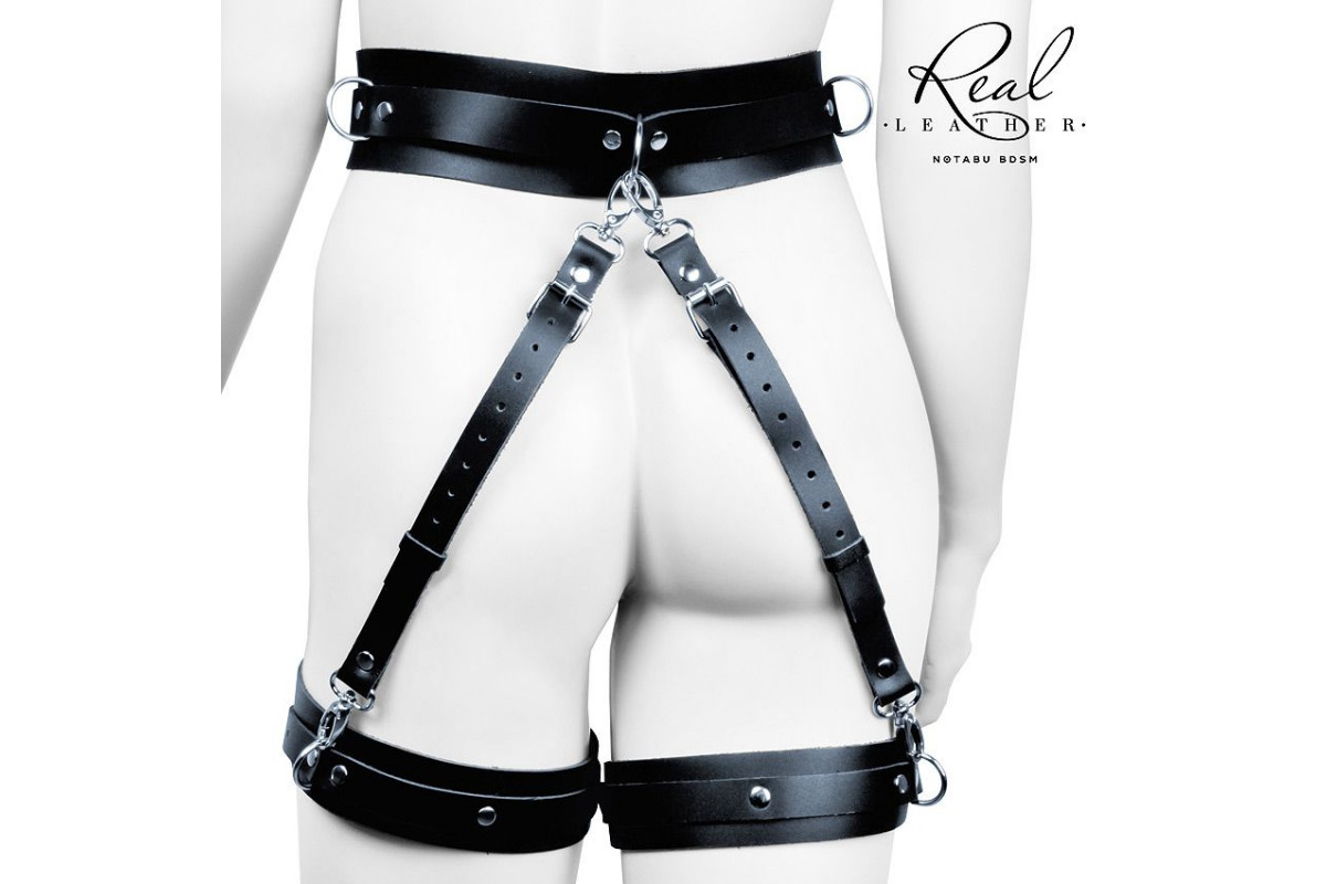 Широкий ремень-пояс фиксируется на талии, более узкие ремни-оковы – на бёдрах. Металлические застёжки регулируют размеры изделия, усиливают или ослабляют натяжение. Пояс и оковы соединяются между собой ремешками с карабинами, что позволяет менять положение гартеров на теле или отсоединять их друг от друга.