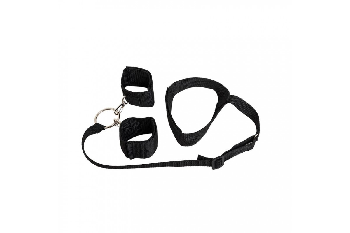 Черный ошейник с длинной лентой и отстегивающимися наручниками