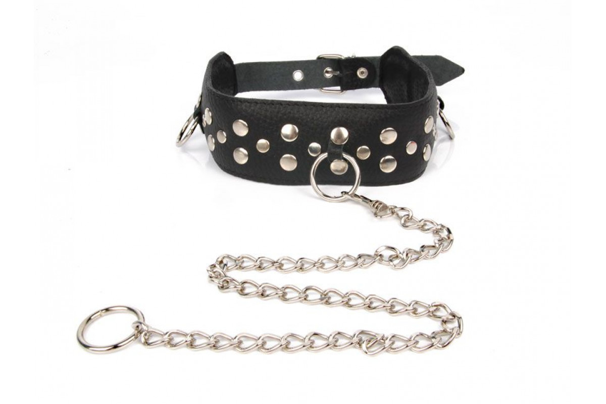 Массивный черный дизайн с заклепками придает аксессуару брутальный и современный вид. Надежный материал обеспечивает долговечность и комфорт при использовании. Металлический поводок-цепочка добавляет элемент игры и создает дополнительные возможности для экспериментов.