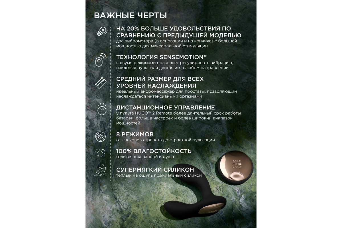 Обновите свои ощущения с помощью Черного вибромассажера простаты с пультом ДУ Hugo 2 Remote. Купите его в нашем магазине и наслаждайтесь качеством, безопасностью и непревзойденным комфортом уже сегодня!