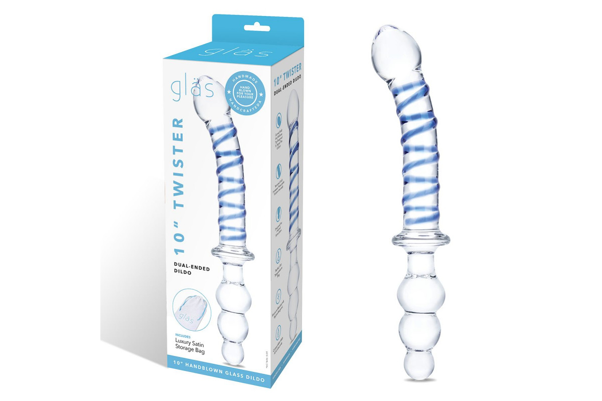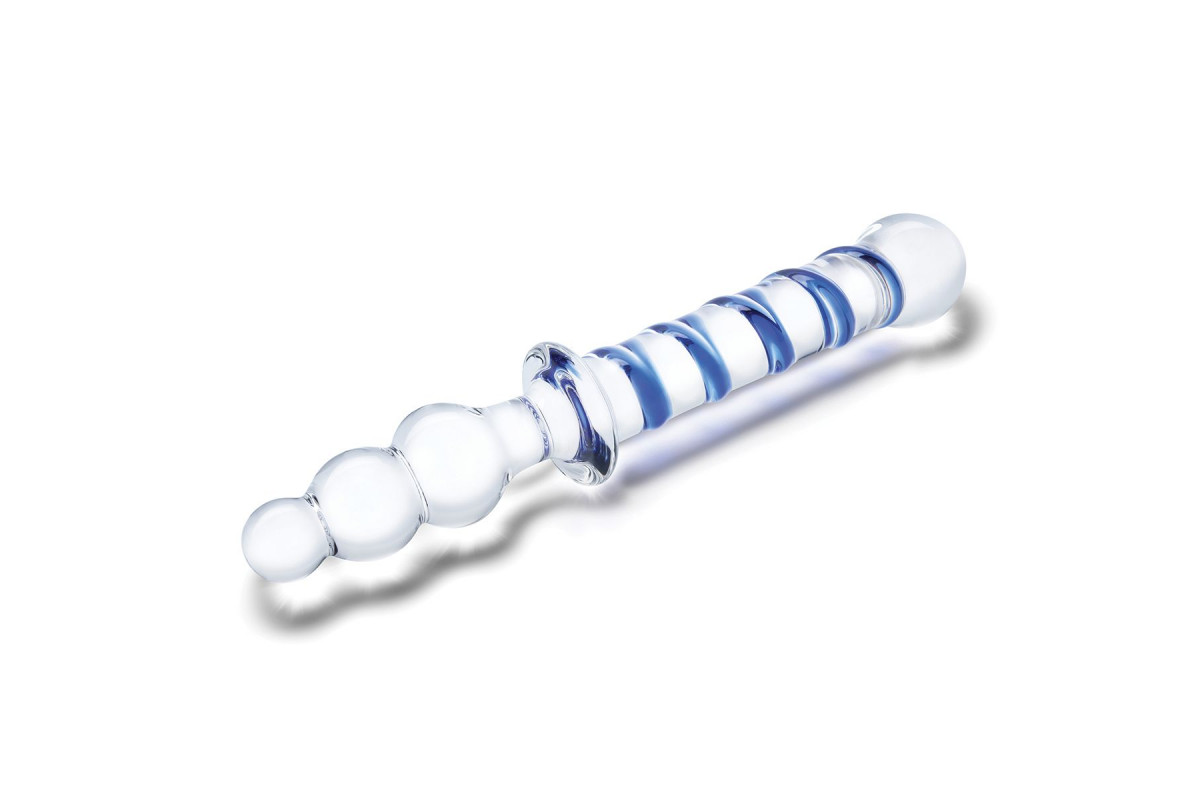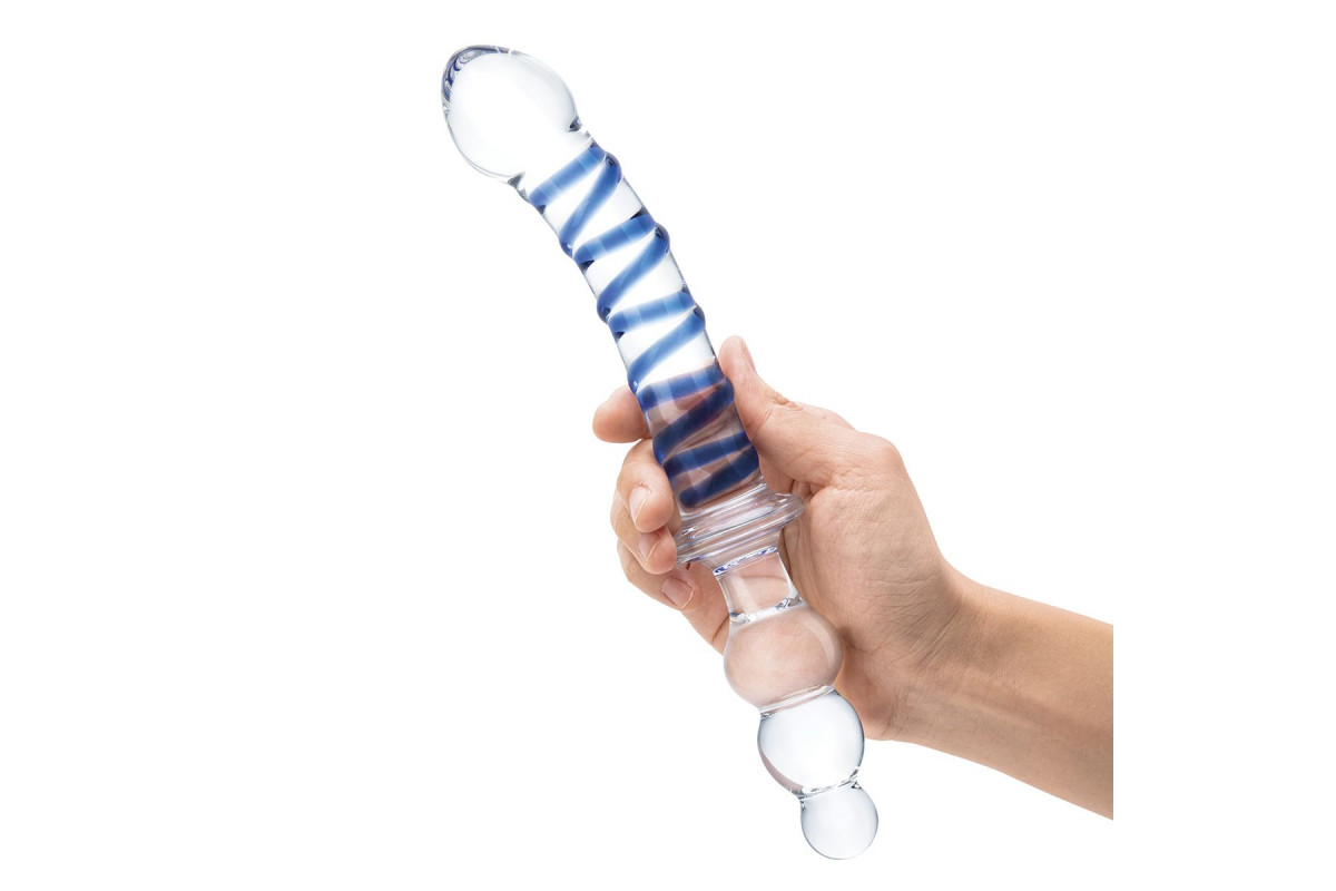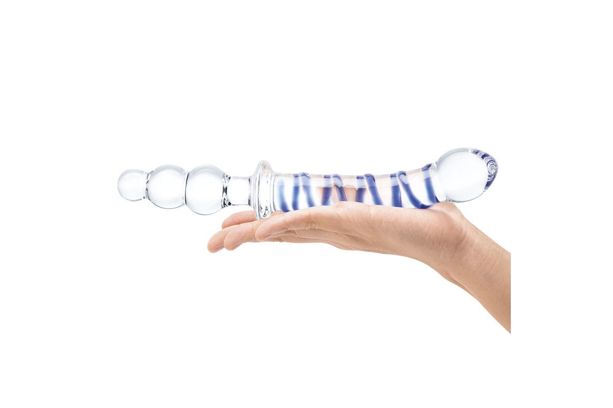 Этот гладкий двухсторонний фаллоимитатор изготовлен из качественного, прочного, приятного для тела стекла. С одной своей стороны он имеет вагинальный фаллос, немного искривленный для воздействия на важные интимные точки, с голубой спиралью по всему стволу и крупной головкой. А на другом конце вы найдете анальную пробку-елочку, с удлиненной ножкой и тремя крупными бусинами. Плоское ограничительное основание в центре игрушки, диаметром 4,5 см, оно расположено так, чтобы фаллоимитатор не вставлялся слишком глубоко. Это отличная игрушка как для новичков, так и для опытных пользователей. Она сделана из прочного стекла, поэтому фаллос твердый, гладкий и легко чистится любым мылом или средством для очистки интимных игрушек. Длина фаллической части - 14,5 см, диаметр - 3,5 см.