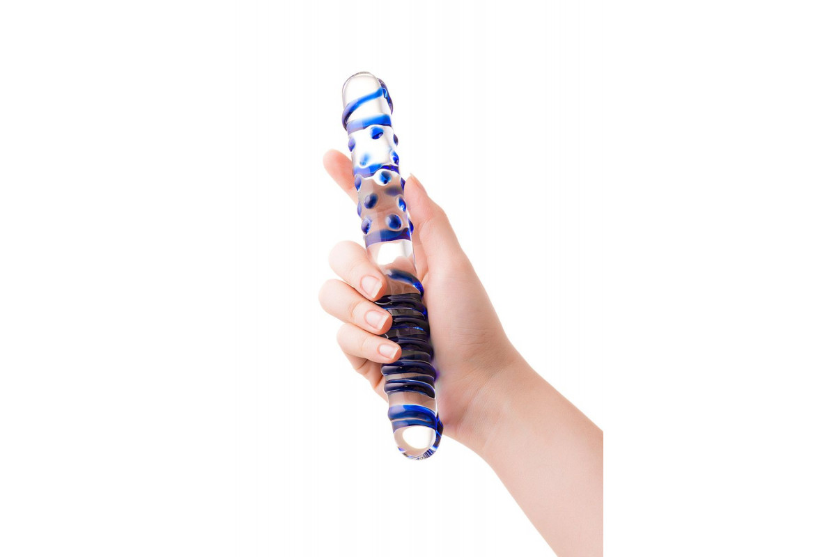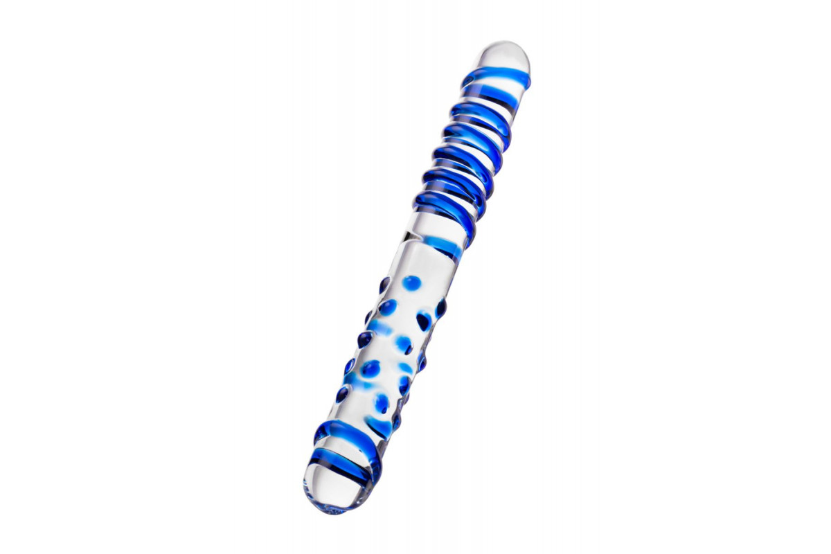 Двусторонний стеклянный фаллоимитатор с рельефом — 22 см