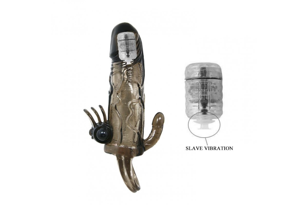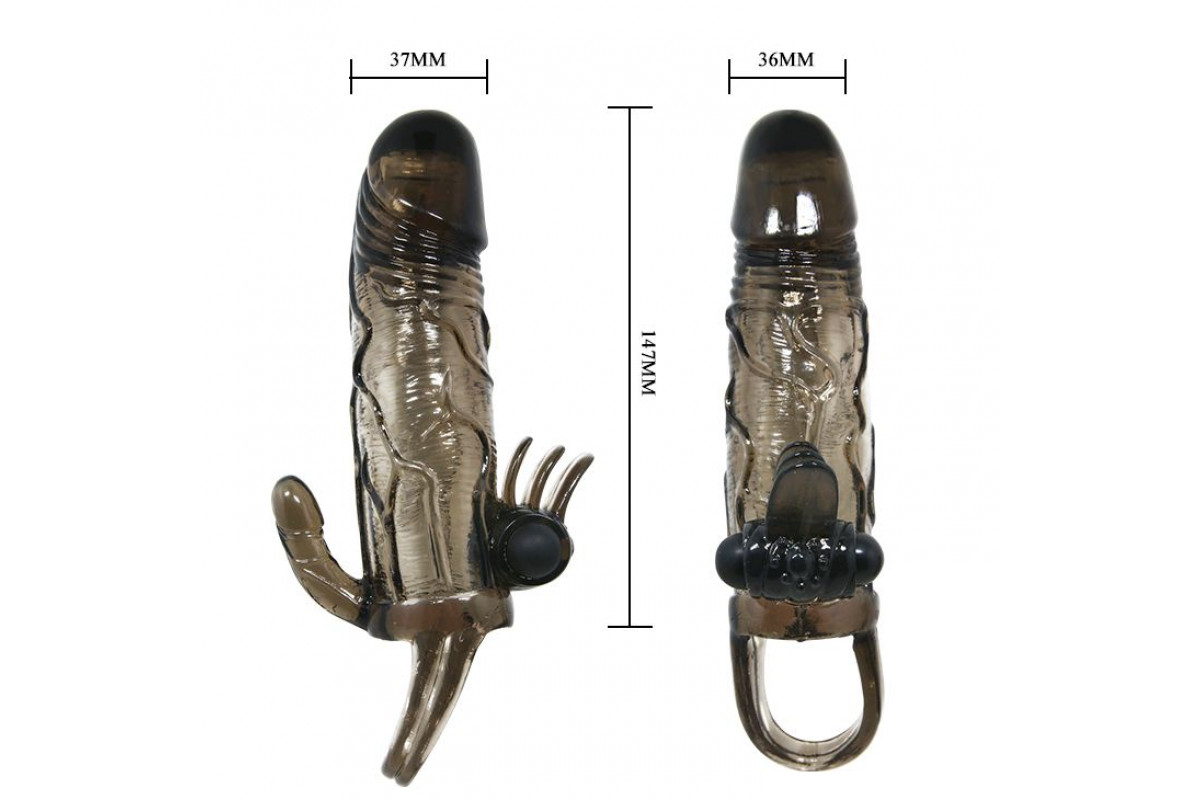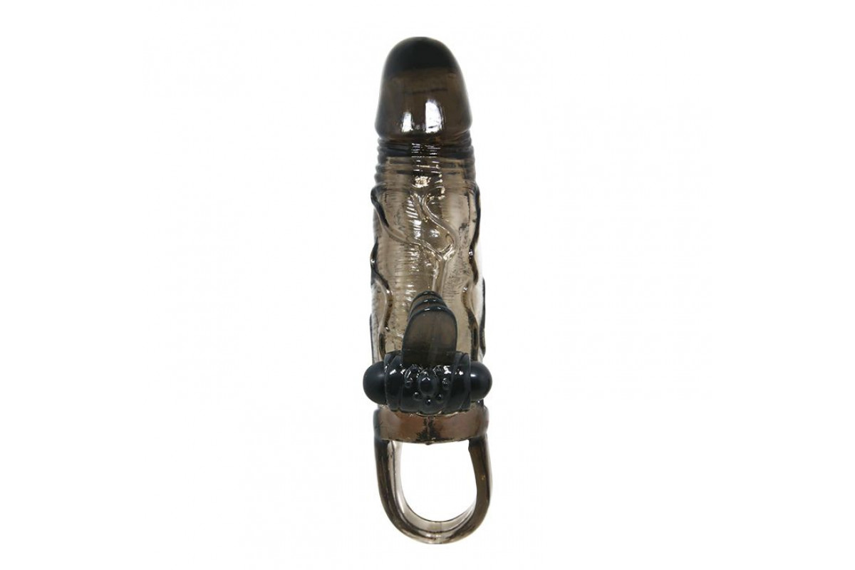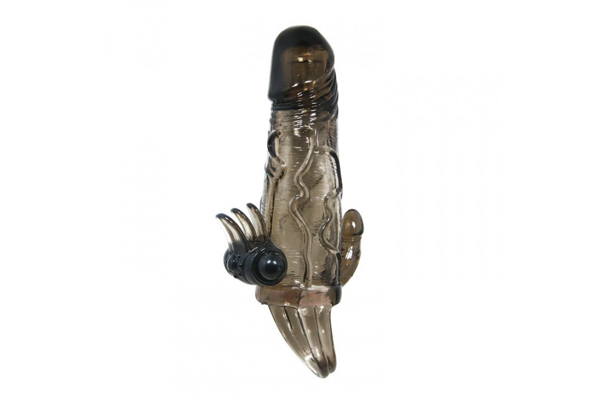 Дымчатая удлиняющая насадка с вибрацией и отростком для преданусного массажа