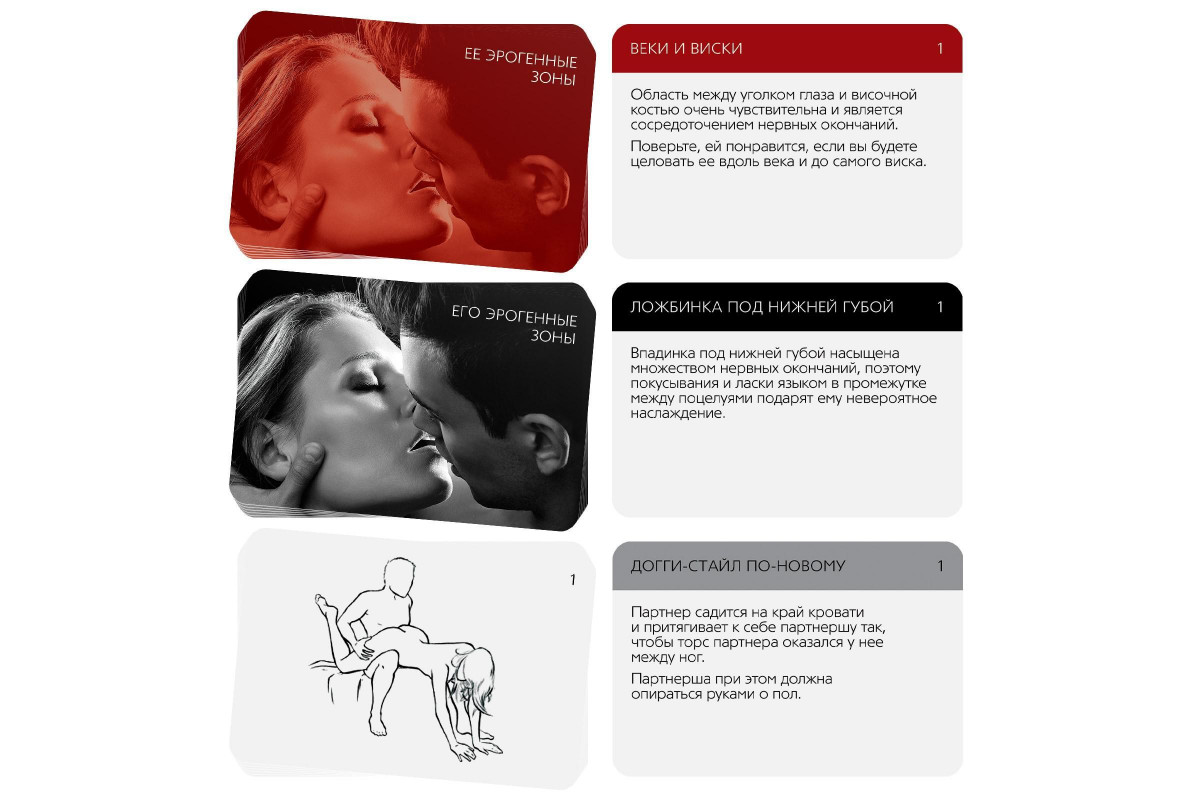 Что нужно делать? Разделите карты на 3 колоды: «Её эрогенные зоны», «Его эрогенные зоны» и «Позы». Определите, с чего вы начнёте игру: с изучения её или его эрогенных зон. Вытяните карточку и воспроизводите то, что там указано.