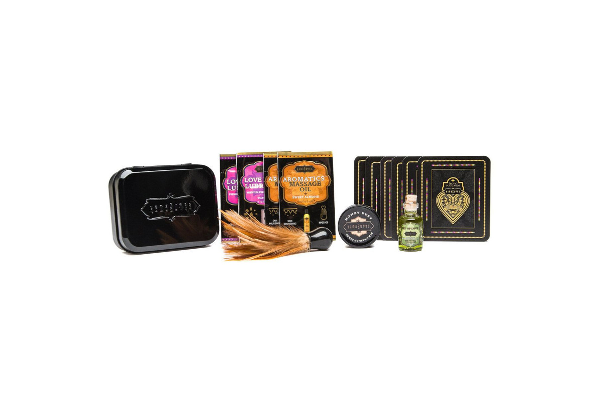 В комплект входят: шесть эротических игровых карт, которые сделают вашу игру веселой и сексуальной, ароматная и вкусная пудра для тела Honey Dust (28 гр.) с перьевой пуховкой для нанесения на кожу, согревающее масло для эрогенных зон (сливочная ваниль, шоколад и пряная корица) Oil of Love в бутылочке (6 мл), два саше с лубрикантом Love Liquid Classic (по 3 мл. каждый) и два саше с массажным маслом (по 3 мл. каждый).
