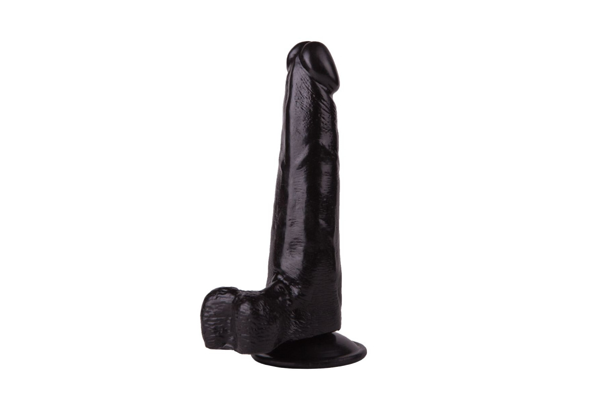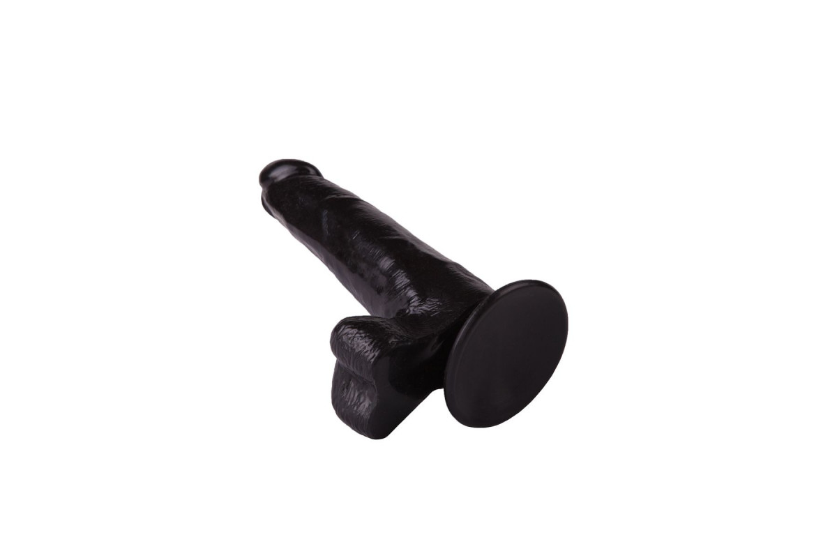 Фаллоимитатор с мошонкой на присоске черного цвета — 16,5 см