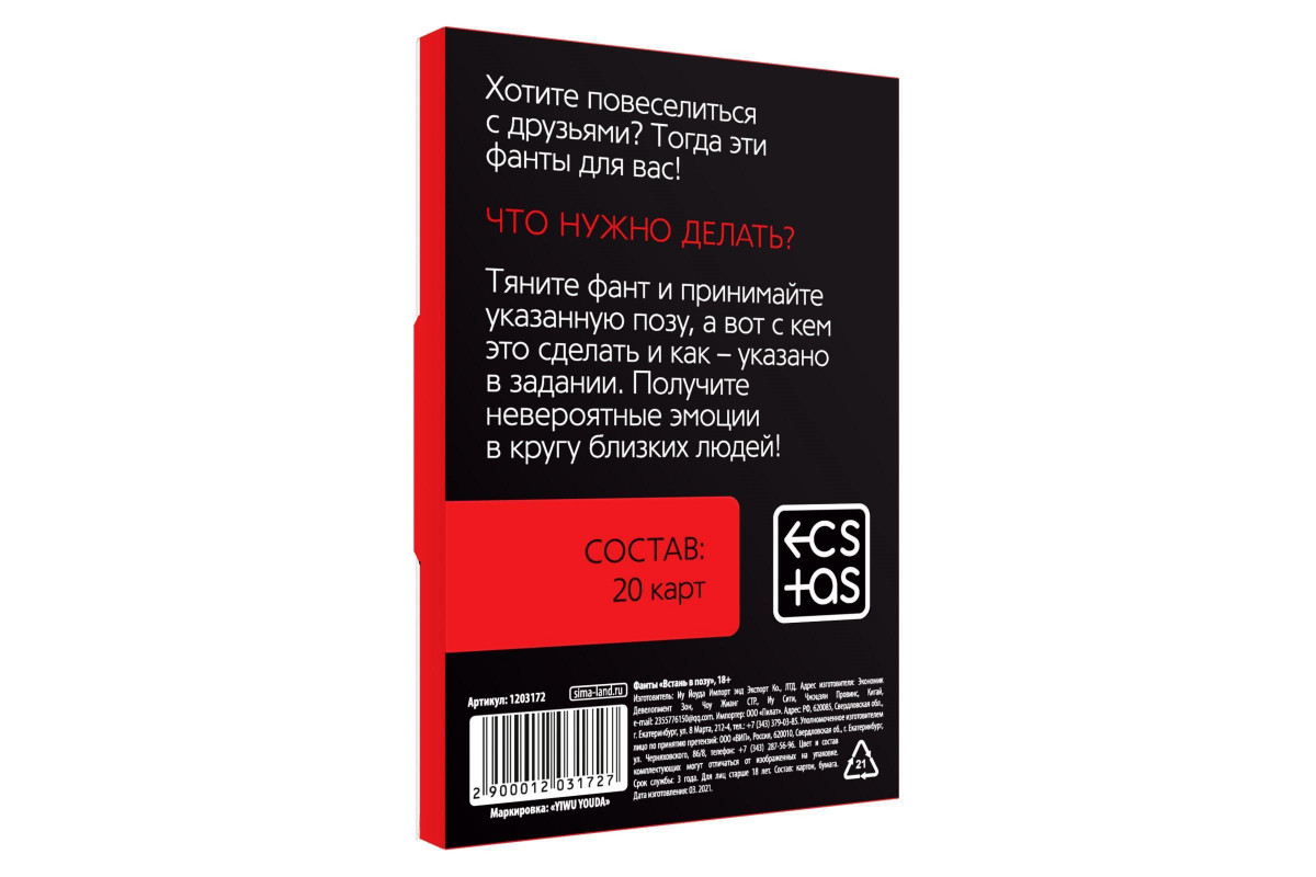 Играйте в «Фанты Встань в позу» и сделайте ваши ночи незабываемыми! Этот увлекательный набор призван разнообразить ваши интимные развлечения, добавив элемент неожиданности и страсти. Идеально подходит для пар, желающих раскрыть новые грани своей сексуальности и укрепить доверие друг к другу.