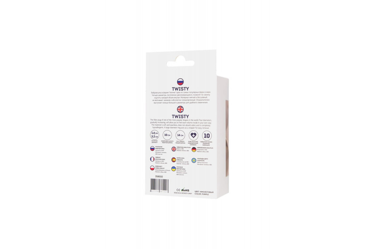 Twisty - вибровтулка в форме ёлочки одна из самых популярных форм в мире. Четыре диаметра, постепенно увеличивающиеся, позволят по своему ощутить каждый объем внутри. Материал мягкий и бесшовный, не впитывает запахов и абсолютно гипоаллергенный. Ограничителем выступает кольцо большого диаметра для удобного извлечения. 10 режимов вибрации, съёмная вибропуля. Рабочая длина - 10 см.