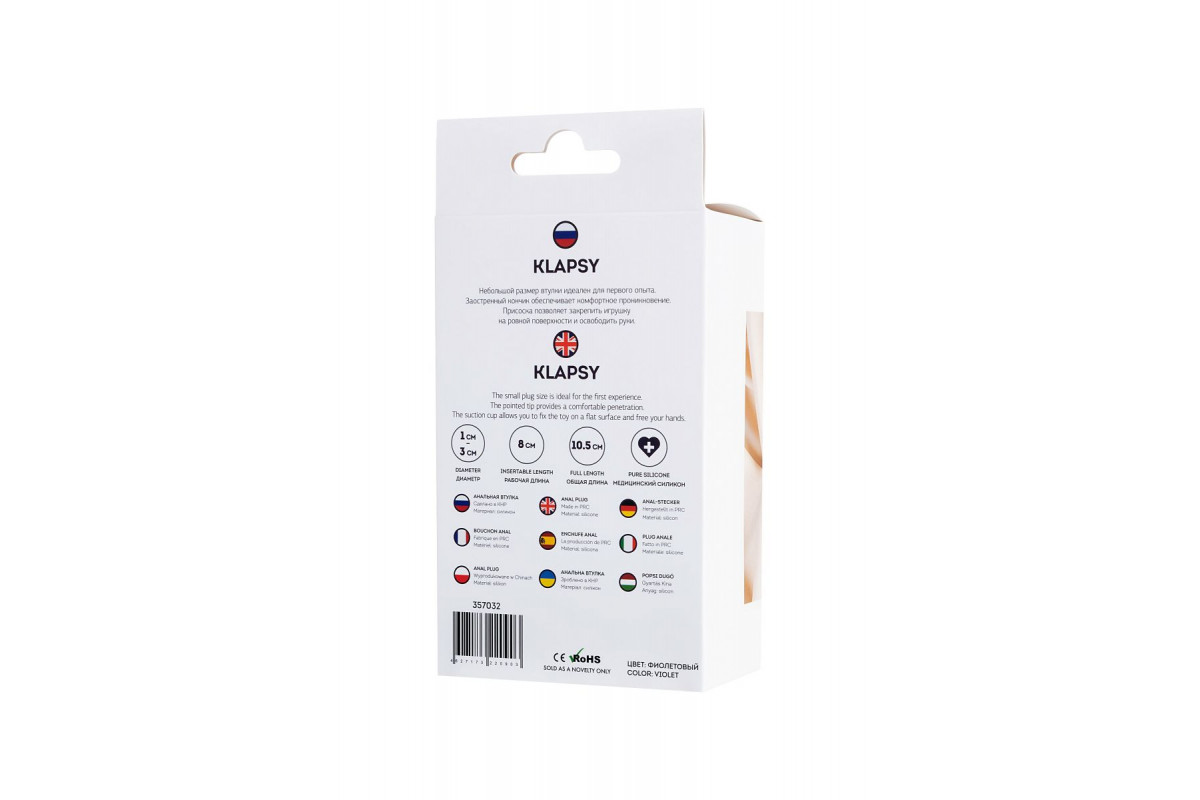 Анальная втулка Klapsy. Небольшой размер втулки идеален для первого опыта. Заостренный кончик обеспечивает комфортное проникновение. Присоска позволяет закрепить игрушку на ровной поверхности и освободить руки. Рабочая длина - 8 см.