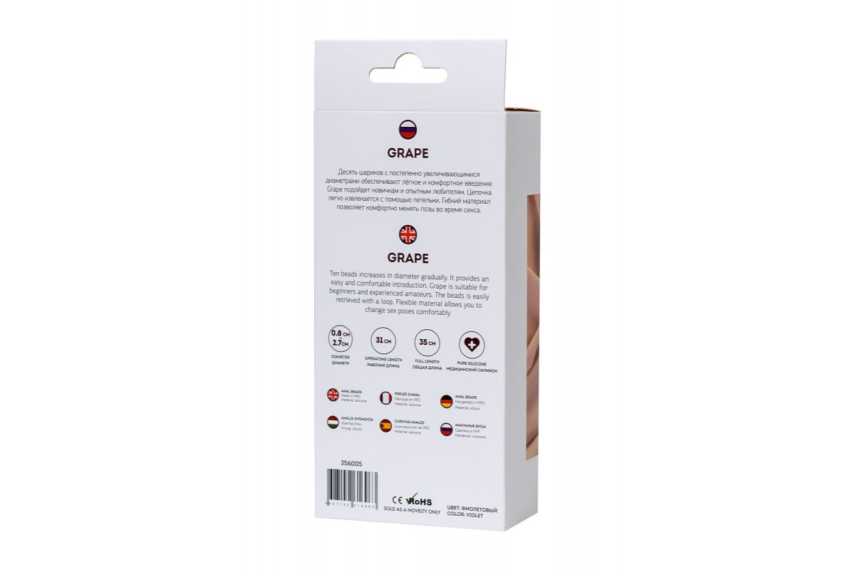 Десять шариков с постепенно увеличивающимися диаметрами обеспечивают легкое и комфортное введение. Grape подойдет новичкам и опытным любителям. Цепочка легко извлекается с помощью петельки. Гибкий материал позволяет комфортно менять позы во время секса. Рабочая длина - 31 см.