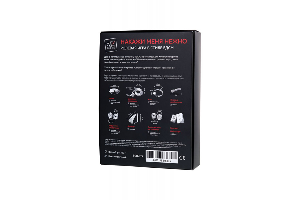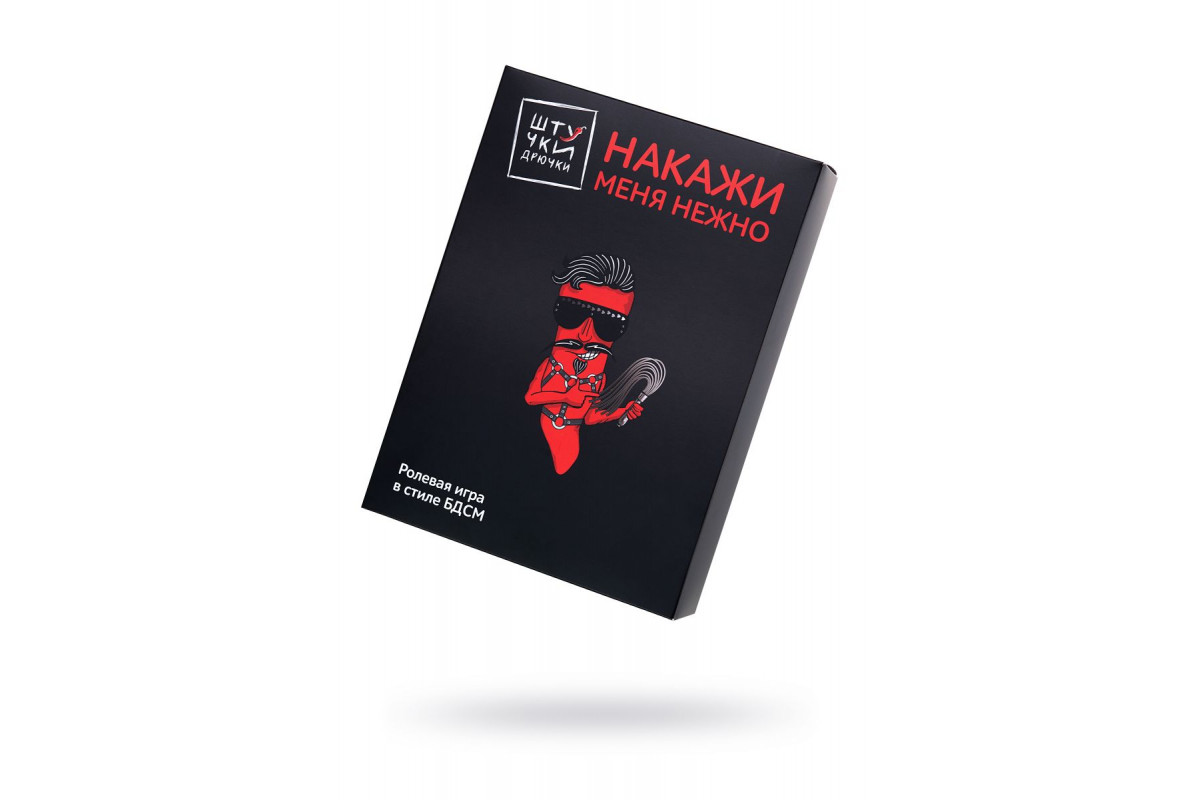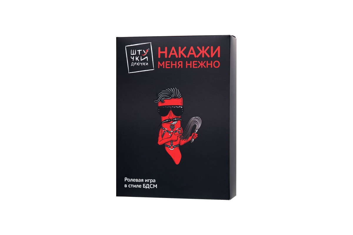 Игра «Накажи меня нежно» — то, что нужно, если вы давно поглядываете в сторону БДСМ, но стесняетесь. Если хочется добавить огня в секс, но не хватет идей. Игра в стиле БДСМ от «Штучек-Дрючек» для тех, кто мечтает о смелых ролевых играх, когда все фантазии сводятся к костюму супергероя или кошечки. Внутри коробки все, что нужно для первого знакомства с БДСМ: карточки со сценариями и аксессуары к ним. Первые помогут определиться с ролью и не бояться, а вторые воплотят в жизнь все желания и доставят максимум удовольствия. Вам понравится, обещаем! В комплекте: наручники, оковы, ошейник с поводком, кляп-шарик, плеть, веревка для связывания, маска на глаза, набор карт, контракт.