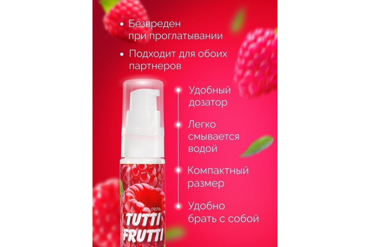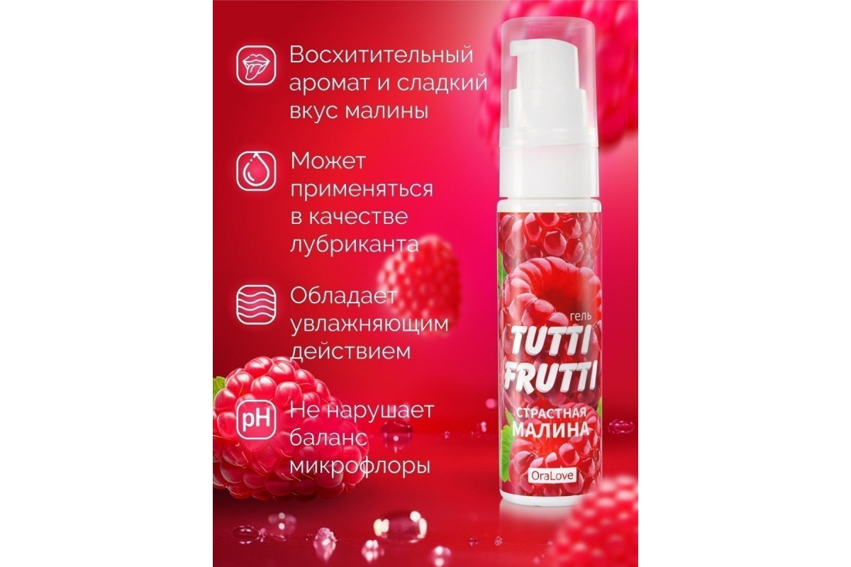 Смазка Tutti-frutti с малиновым вкусом может применяться обоими партнёрами, совместима с изделиями из латекса и синтетических материалов.