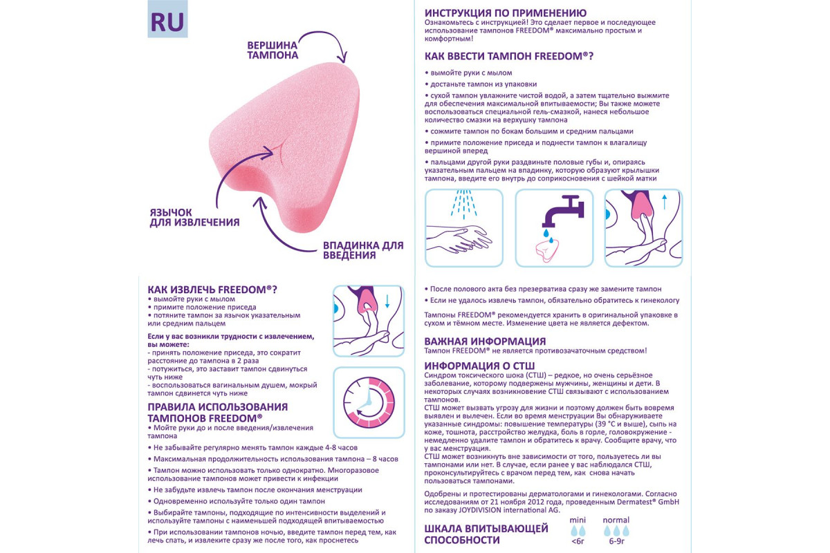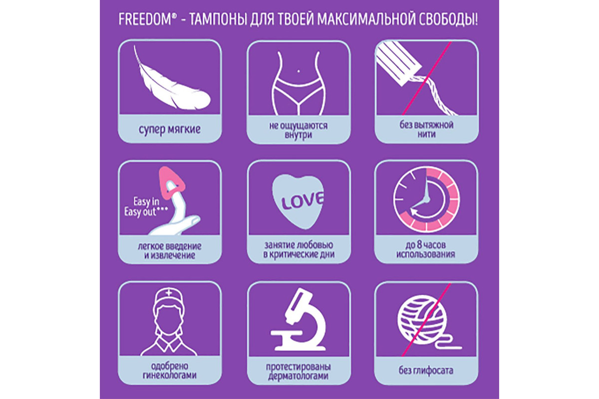 Тампоны FREEDOM® обеспечивают не только надежную защиту от выделений в критические дни, но и дают возможность не отказываться от своих обычных увлечений и планов! Заниматься любовью, спортом, плавать в бассейне, танцевать, встречаться с друзьями в СПА или отдыхать на пляже – с FREEDOM® все это возможно даже в критические дни! Подробная инструкция в каждой упаковке!