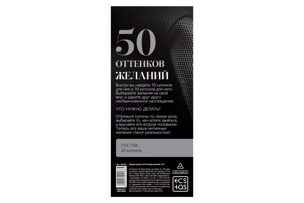 Погрузитесь в мир фантазий и незабываемых ощущений с нашим уникальным набором Горячих купонов 50 оттенков желаний. Этот комплект создан для тех, кто хочет добавить ярких красок в свою интимную жизнь и открыть для себя новые грани удовольствия.