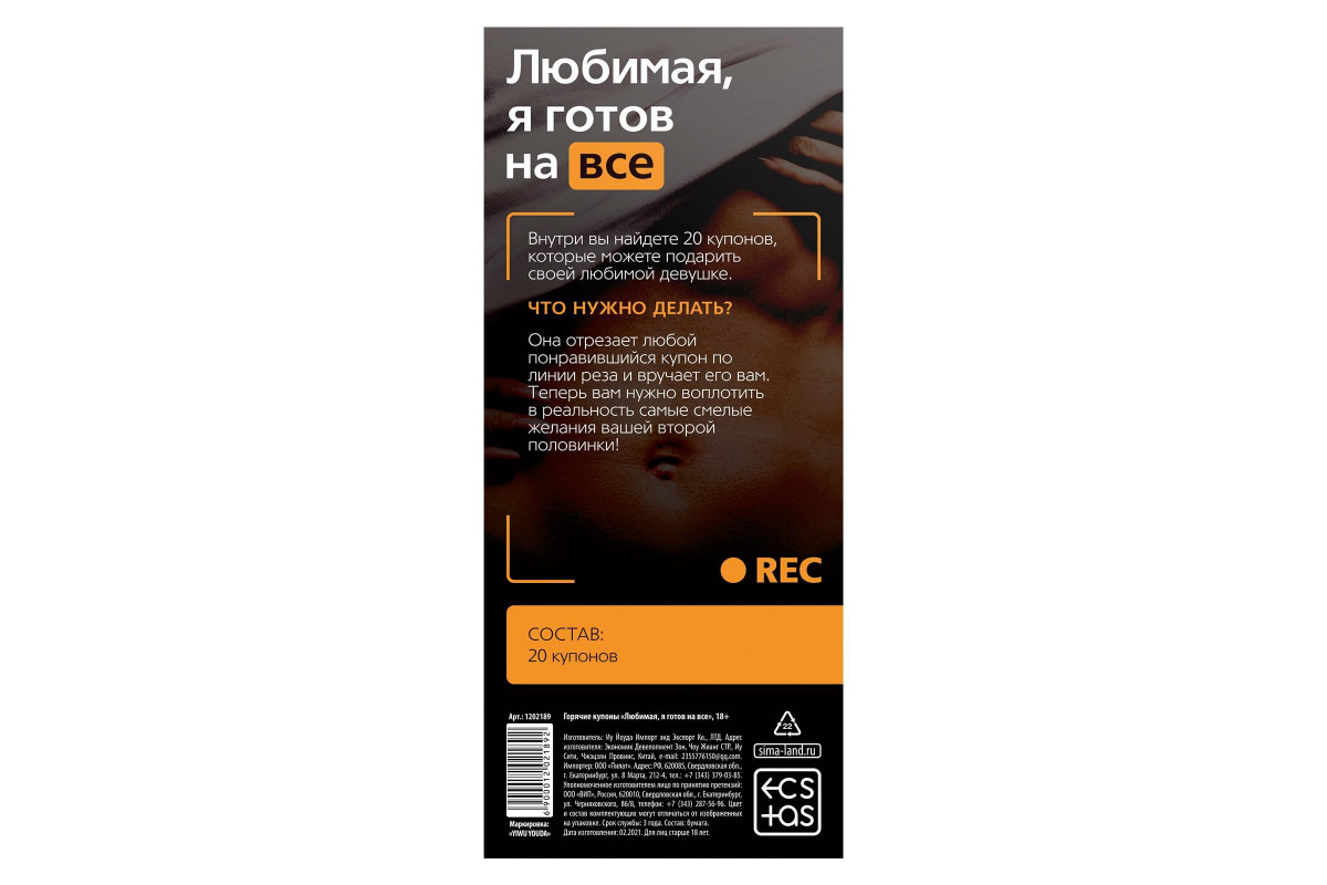 Откройте для себя новые грани страсти и романтики с нашим уникальным предложением Любимая, я готов на все. Этот набор горячих купонов станет отличным дополнением к вашему интимному отдыху, помогая создать незабываемые моменты и укрепить ваши отношения.