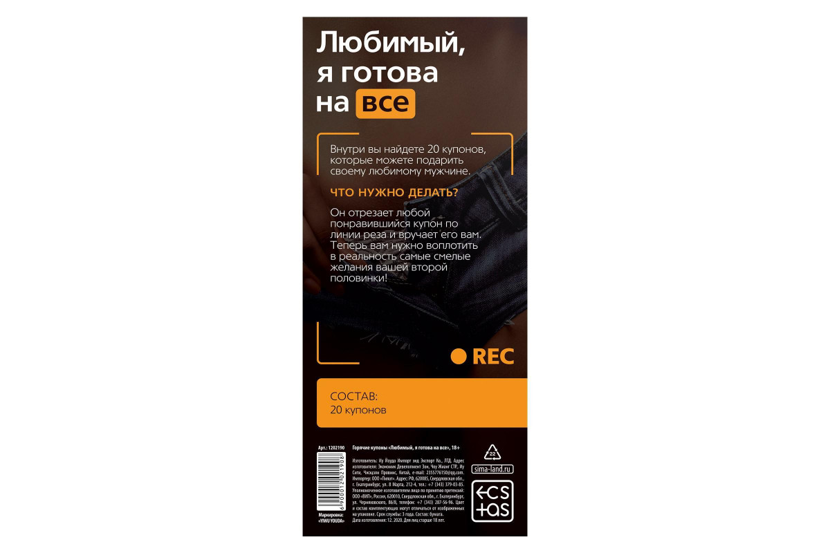 Откройте новые горизонты страсти и романтики с нашим уникальным предложением Любимый, я готова на все. Этот набор горячих купонов поможет вам сделать ваши романтические вечера незабываемыми и наполненными яркими эмоциями.