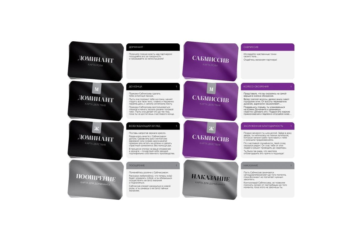 В комплекте вы найдете разнообразные сценарии, задания и идеи, которые помогут вам раскрыть свою фантазию и сделать ваш вечер незабываемым. Игра включает: