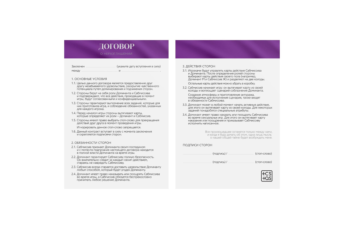 Вы готовы установить особые правила игры? Подпишите договор о неразглашении и выберите желаемую роль. Один из вас будет доминирующим (доминантом), а другой — подчиняющимся (сабмиссивом). Доминирующий вступит в права владения телом и желаниями партнёра, а подчиняющемуся предстоит покорно следовать указаниям и… сдерживать крики удовольствия.