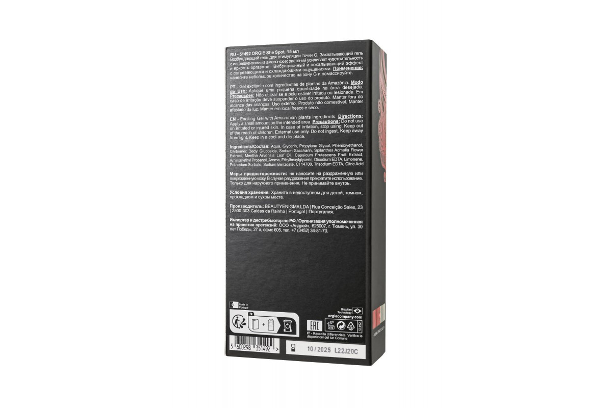 - Инструкция: Нанесите небольшое количество на зону G и подождите несколько секунд для достижения эффекта. Мы советуем вам начать с минимального количества и, оценив вашу чувствительность к воздействию, увеличить или уменьшить дозу в соответствии с вашей чувствительностью.