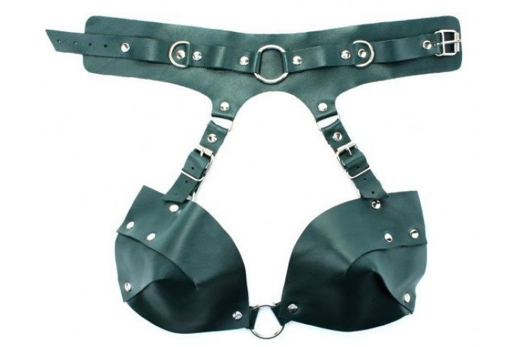 Роскошная сбруя выполнена из натуральной кожи изумрудного цвета. Высокий ошейник с металлическим кольцом спереди присоединяется к изысканному кожаному лифу. Сбруя фиксируется ремнями и пряжками, позволяющими подобрать нужный размер. Ошейник подходит на обхват от 31 до 42 см. Подойдет на размеры S, M, L. Страстный аксессуар станет отличным дополнением к БДСМ игре. Ширина ошейника - 5,5 см.