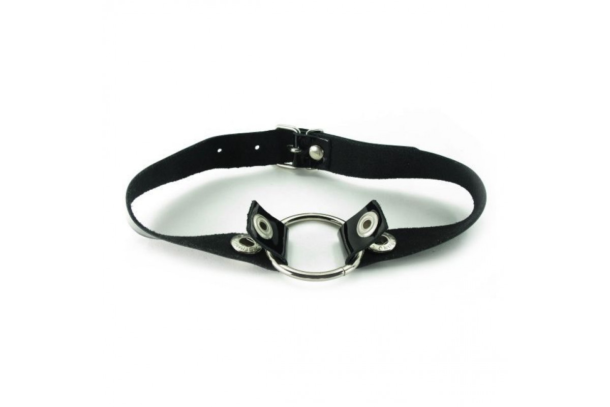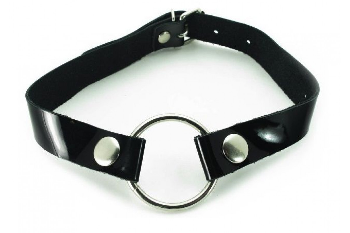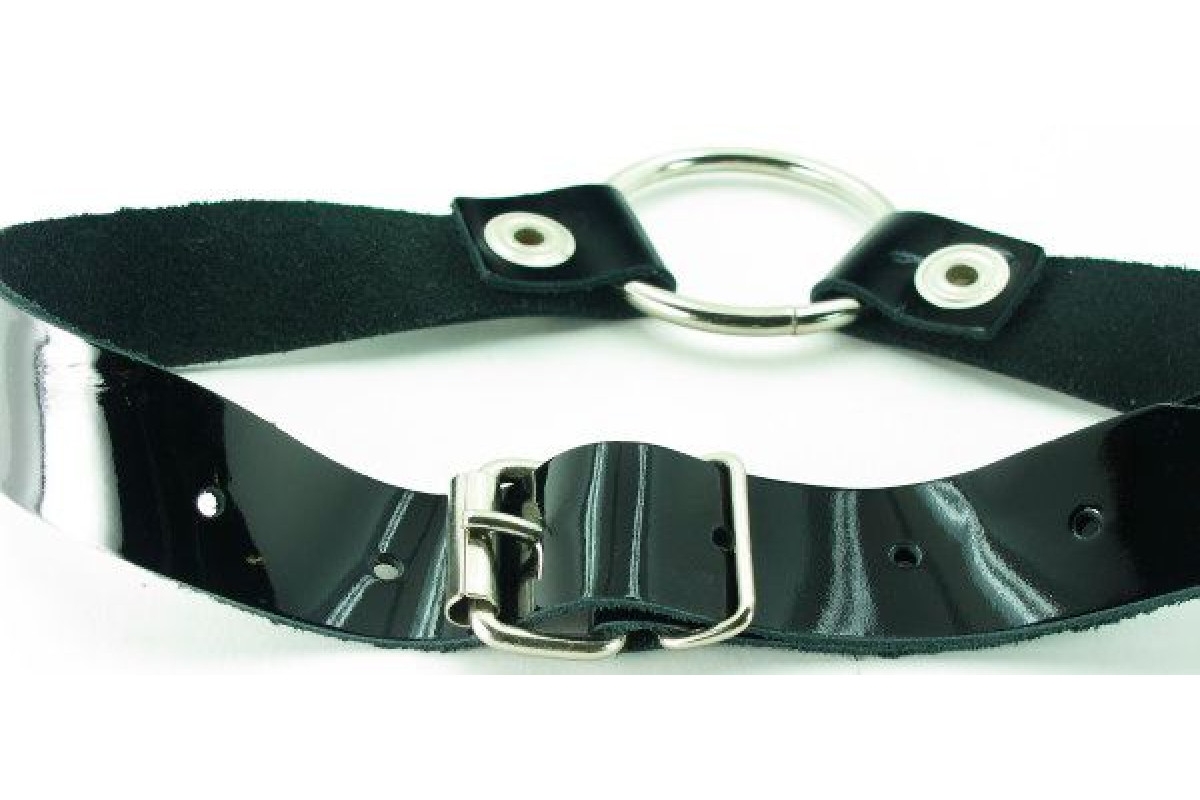 Кляп-кольцо на чёрных лаковых ремешках с кнопками — добавьте остроты в ваши интимные игры