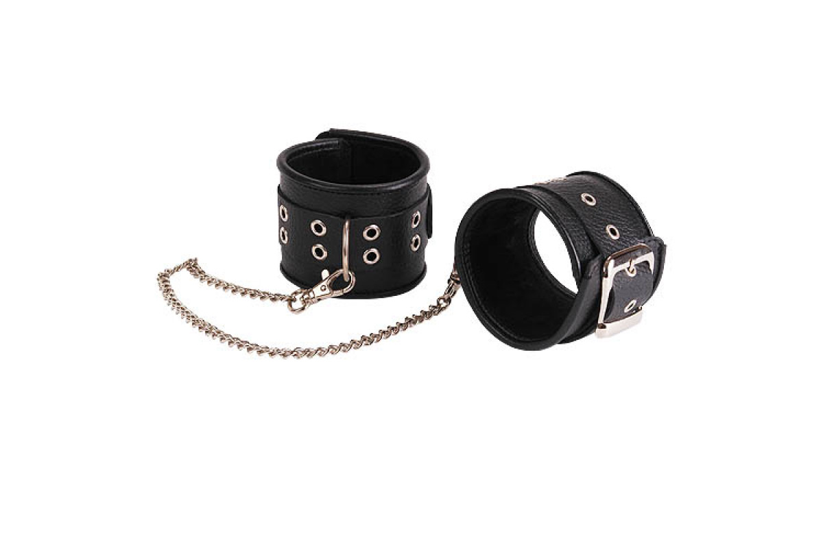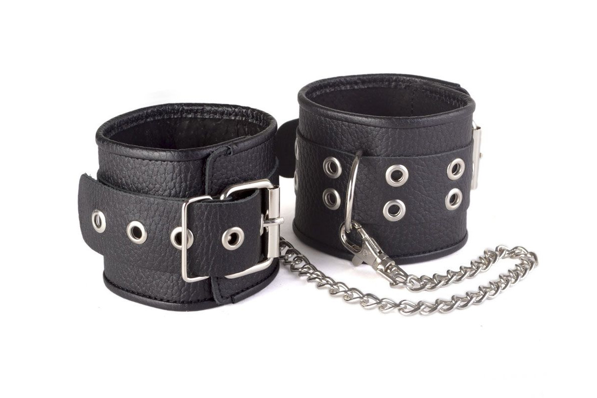 Кожаные черные оковы с широким ремешком, соединенные цепочкой