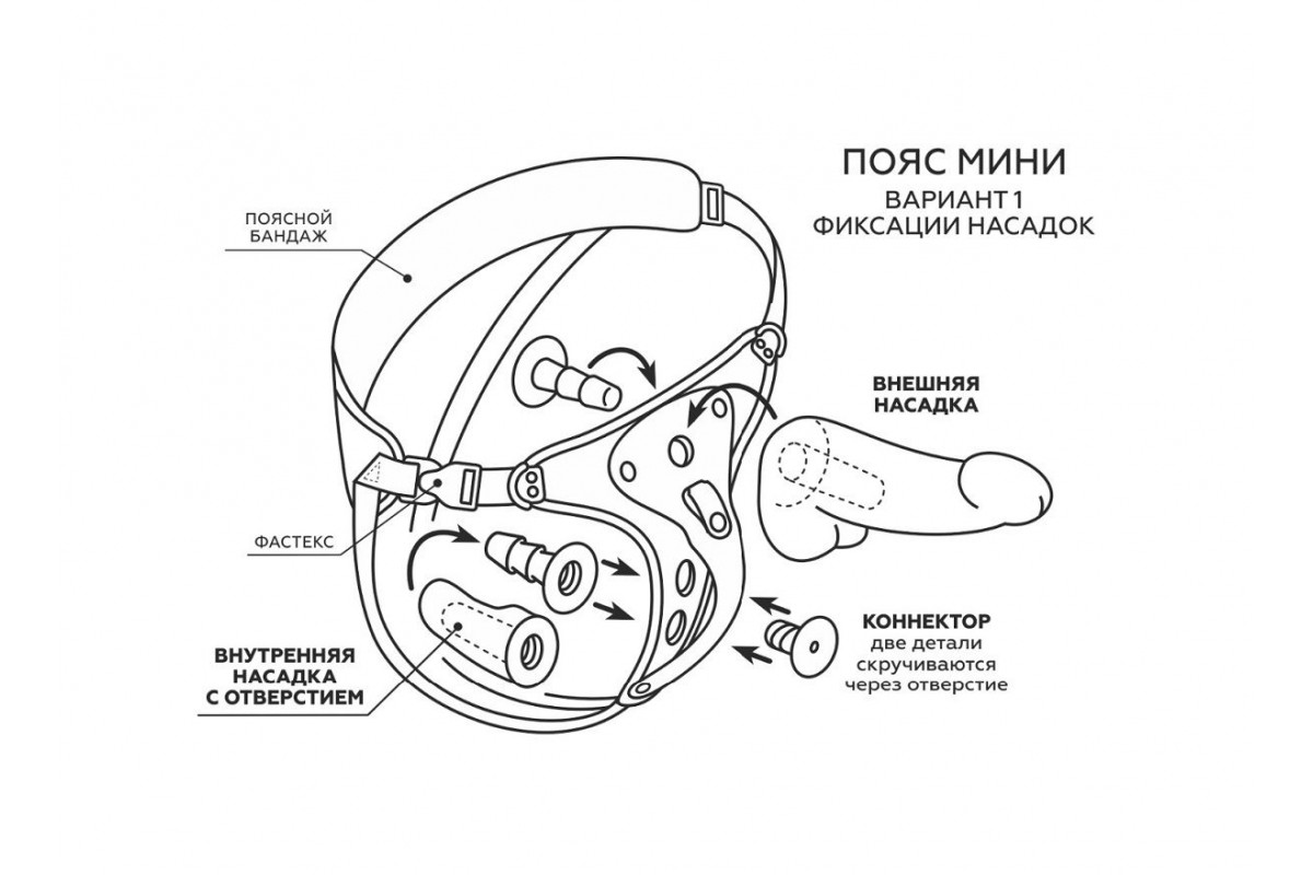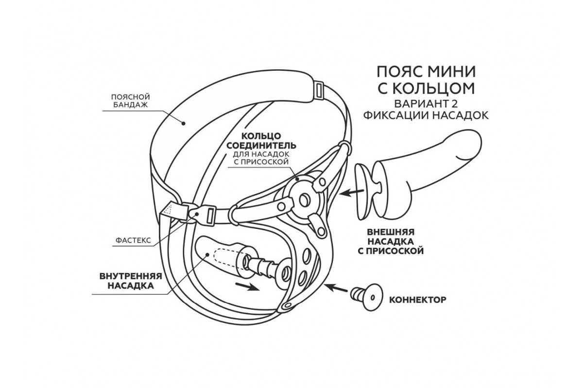 Можно зафиксировать кольцом любой фаллоимитатор на присоске (2 кольца в наборе комплекта с разными диаметрами). Для смены колец – необходимо расстегнуть кнопки ремней вокруг отверстия и поставить подходящее по размеру кольцо.