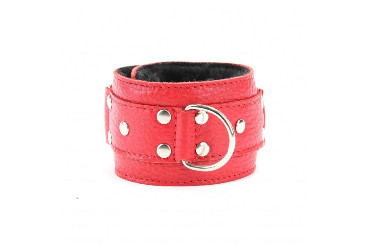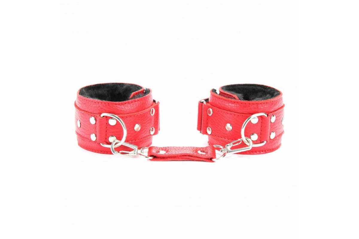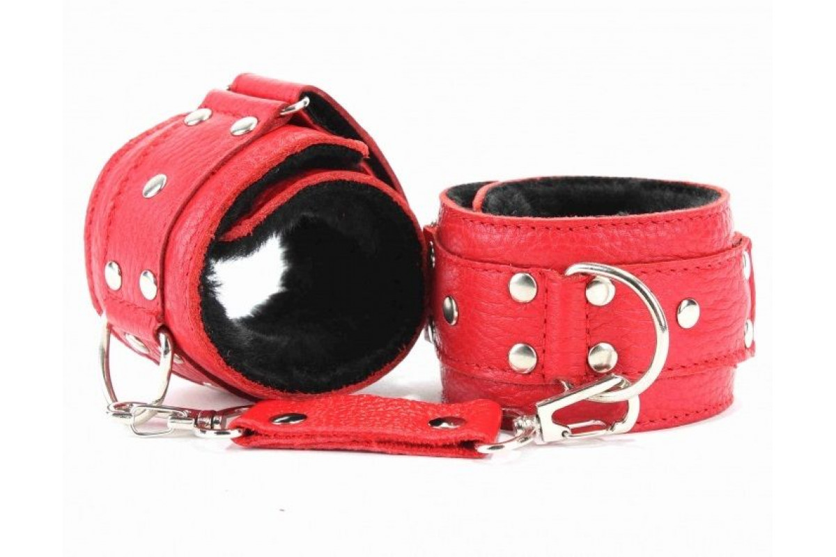 Красные кожаные наручники с меховым подкладом