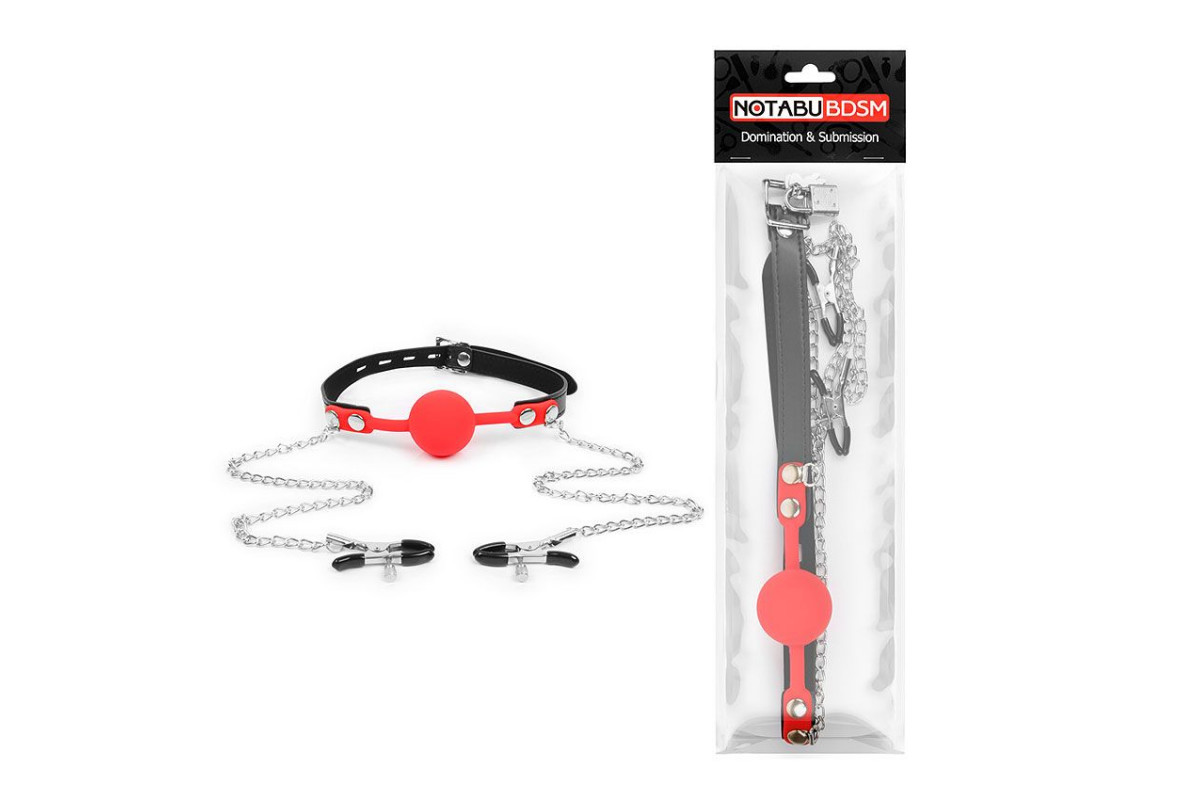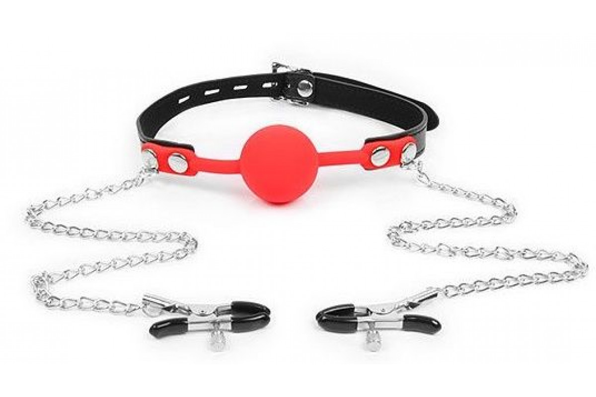 Красный кляп-шарик с зажимами на соски на металлической цепочке