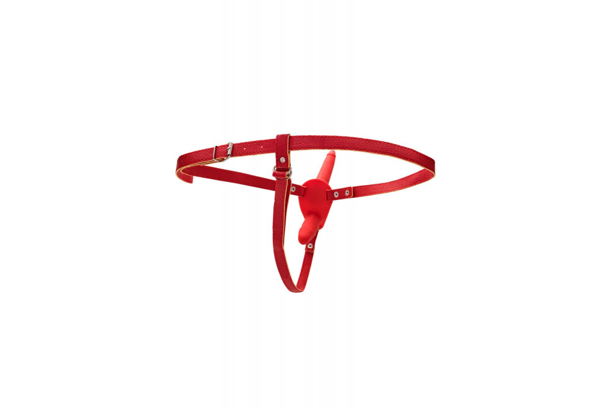 Красный страпон на ремнях с вагинальной пробкой — 15 см