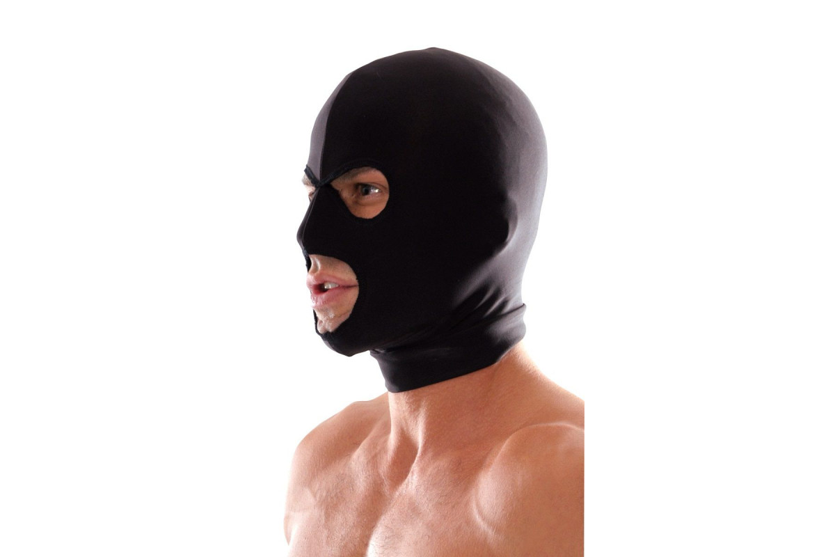 Маска унисекс с тремя отверстиями (для рта и глаз). Изготовлена из слегка просвечивающегося стрейчевого материала (спандекс). Подходит для большинства размеров. Придайте таинственности Вашим отношениям!