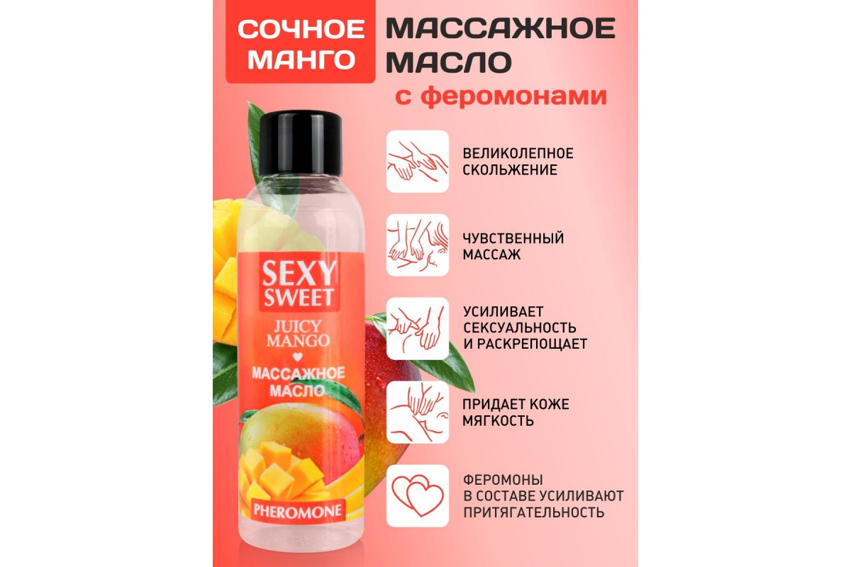 Откройте для себя новые грани чувственности с массажным маслом Sexy Sweet Juicy Mango. Это уникальное средство создано для тех, кто ценит комфорт, свежесть и возбуждающие ароматы. Благодаря насыщенному аромату спелого манго и добавленным феромонам, оно помогает усилить взаимное притяжение и создать атмосферу страсти.
