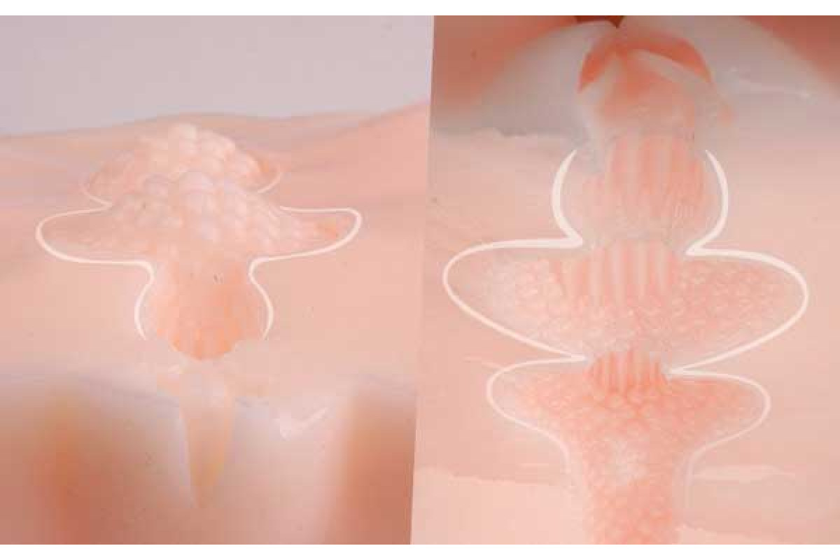 -Большие и малые половые губы выполнены в разных цветах (бежевом и красном), что дает простор для вашего воображения при открывании больших половых губ. -Реалистичные ощущения девственной вагины.