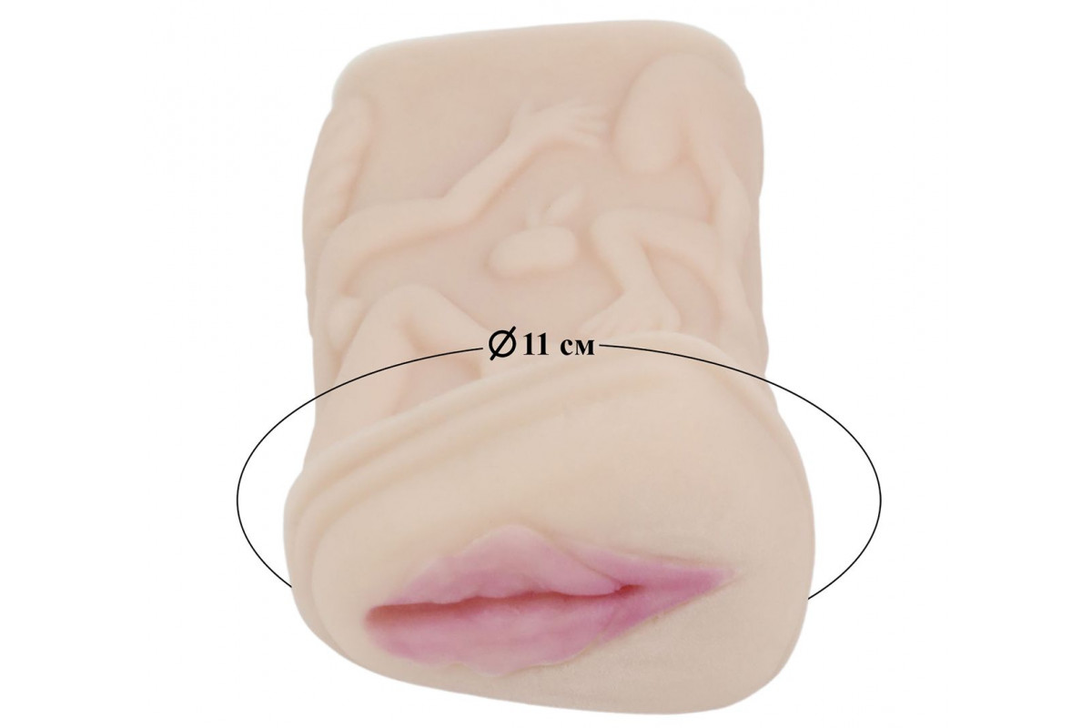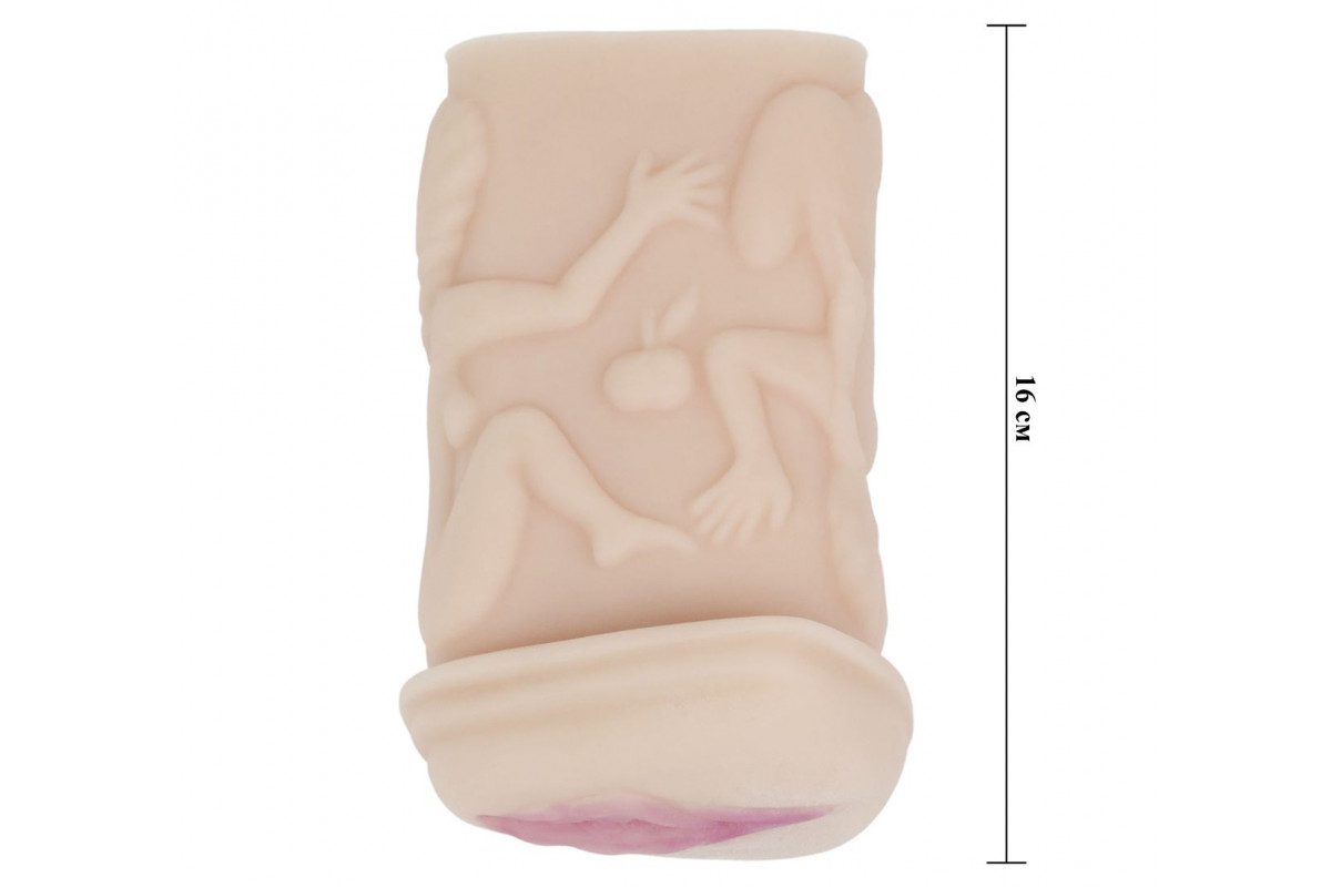 Вход в рельефный тоннель окружают пышные розовые половые губы. Поверхность украшена объёмным рисунком для предотвращения выскальзывания игрушки из рук на пике блаженства.