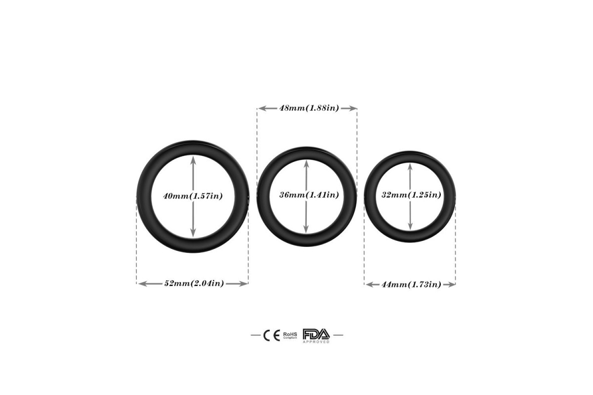 Какие точные размеры у товара Набор из 3 черных эрекционных колец Stay Hard и кому он подойдёт?