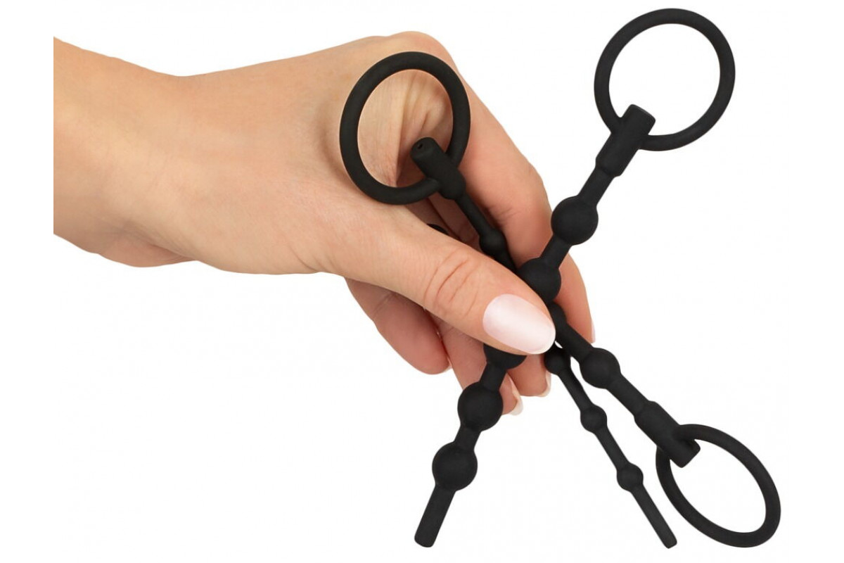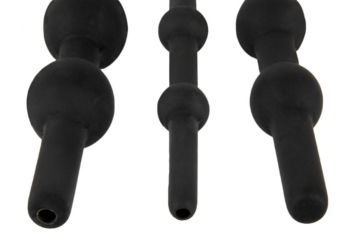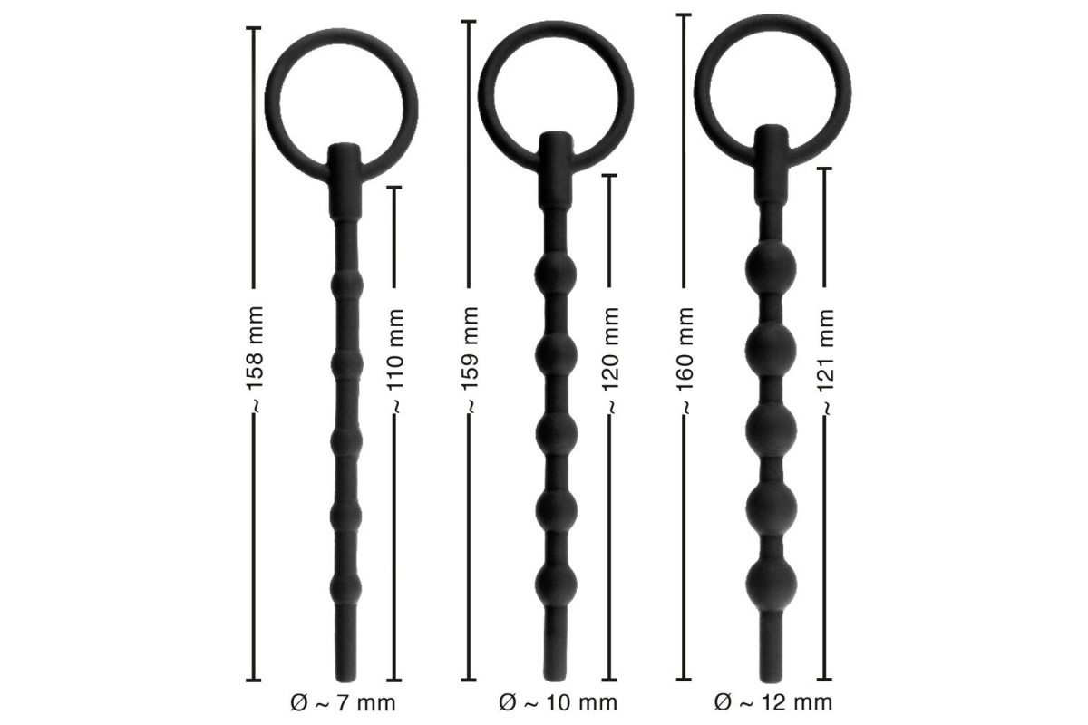 Набор для стимуляции пениса с 3 различными расширителями. Все три изготовлены из бархатистого мягкого силикона, и каждый из них имеет стимулирующие бусины разного диаметра. Каждый расширитель имеет закругленный кончик и кольцо для легкого ввода и извлечения. Они также гибкие и податливые для нежного, комфортного использования. Длина малого стимулятора - 15,8 см, рабочая длина - 11 см, диаметр - 0,7 см.