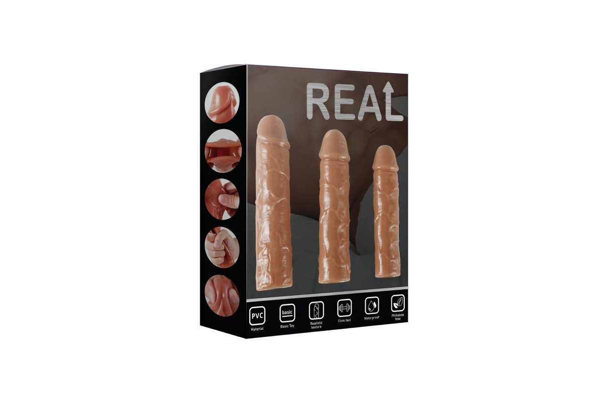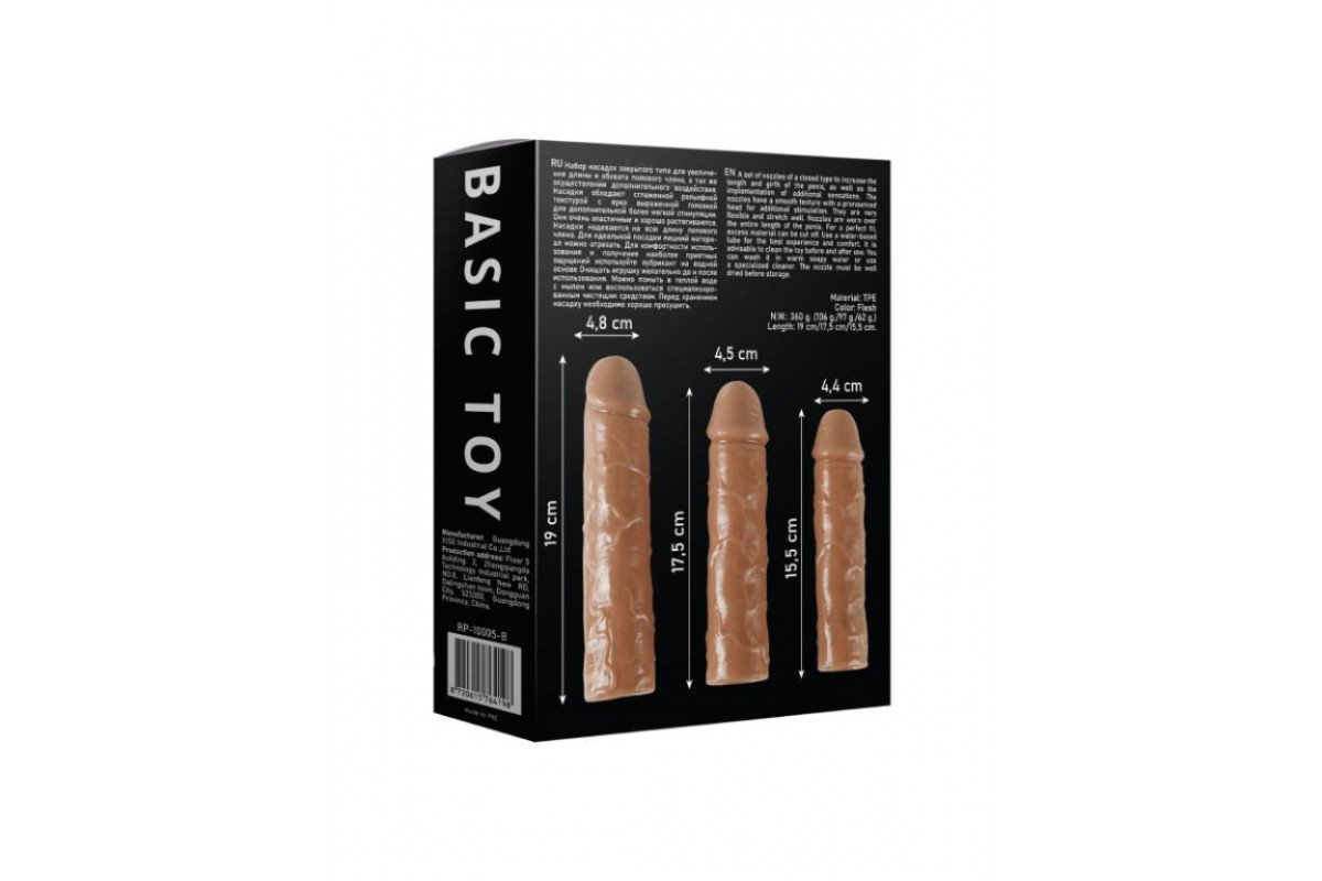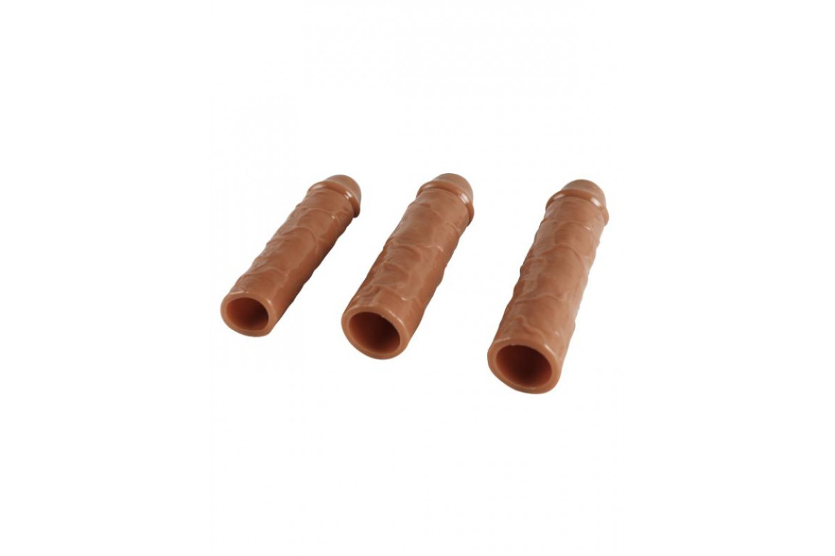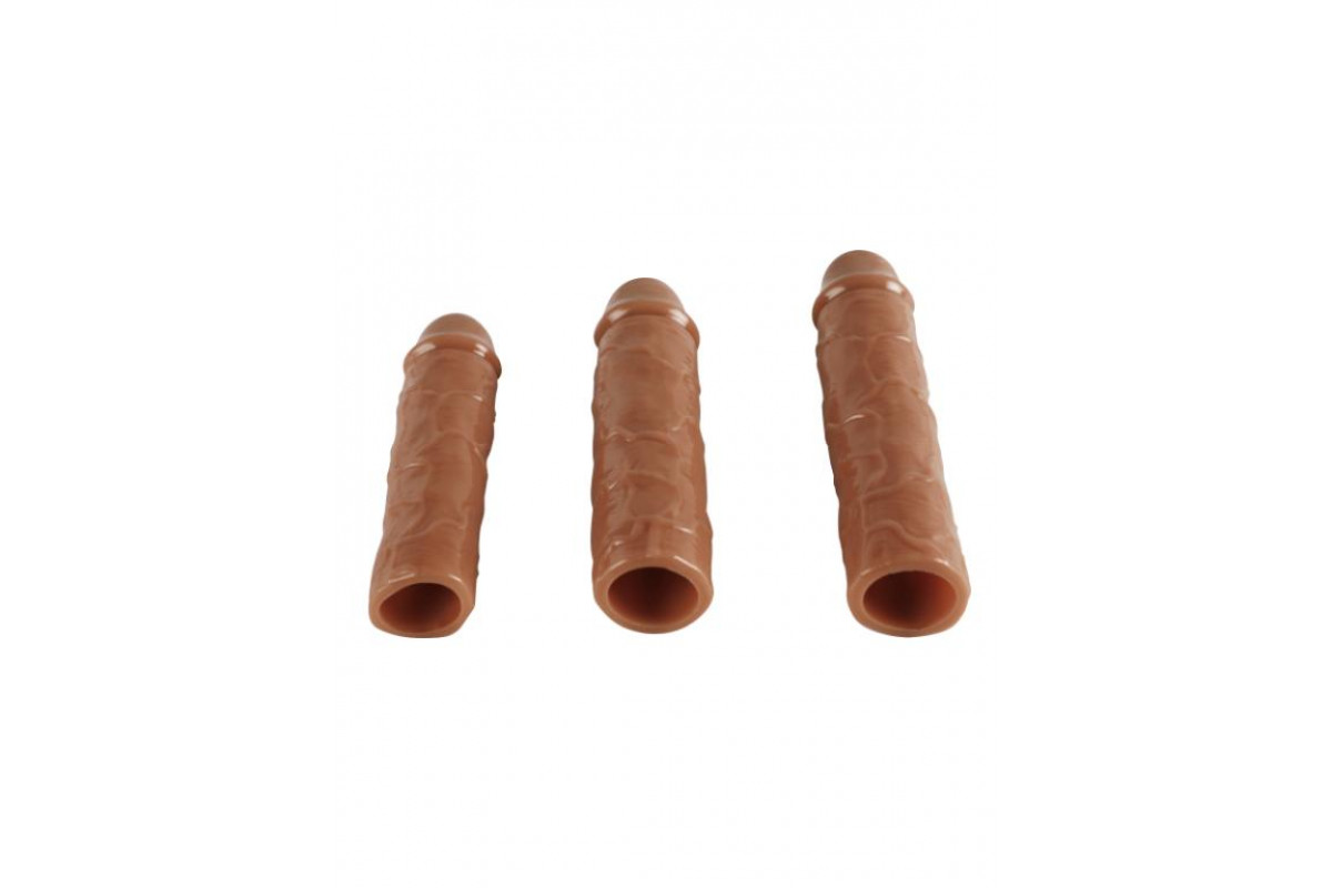 Набор насадок закрытого типа для увеличения длины и обхвата полового члена, а так же осуществления дополнительного воздействия. Насадки обладают сглаженной рельефной текстурой с ярко выраженной головкой для дополнительной более мягкой стимуляции. Они очень эластичные и хорошо растягиваются. Насадки надевается на всю длину полового члена. Для идеальной посадки лишний материал можно отрезать. Длина маленькой насадки - 15,5 см, диаметр - 4,4 см.
