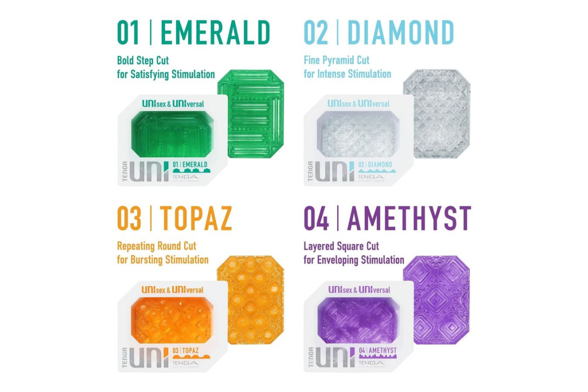 Серия мастурбаторов Tenga Uni вдохновлена драгоценными камнями и может стать настоящим сокровищем в вашей коллекции. Каждый стимулятор отличается цветом и рельефом внутренней поверхности, который подходит под любой вид игры. Сжимайте, массируйте, растягивайте – делайте любые манипуляции для получения максимального удовольствия.