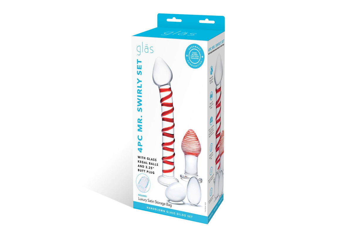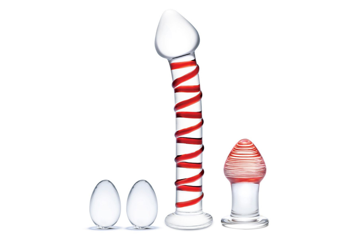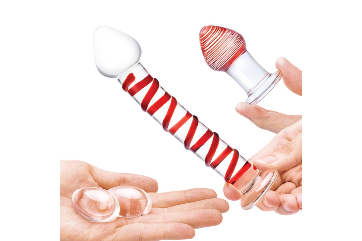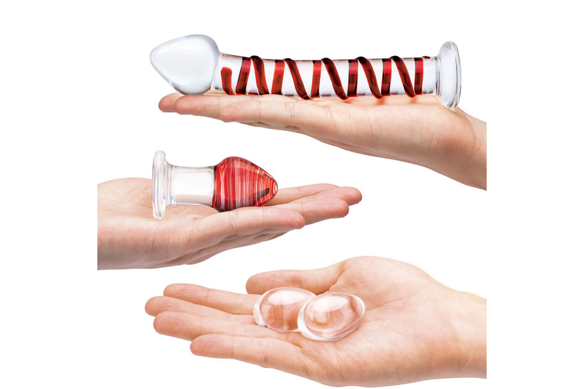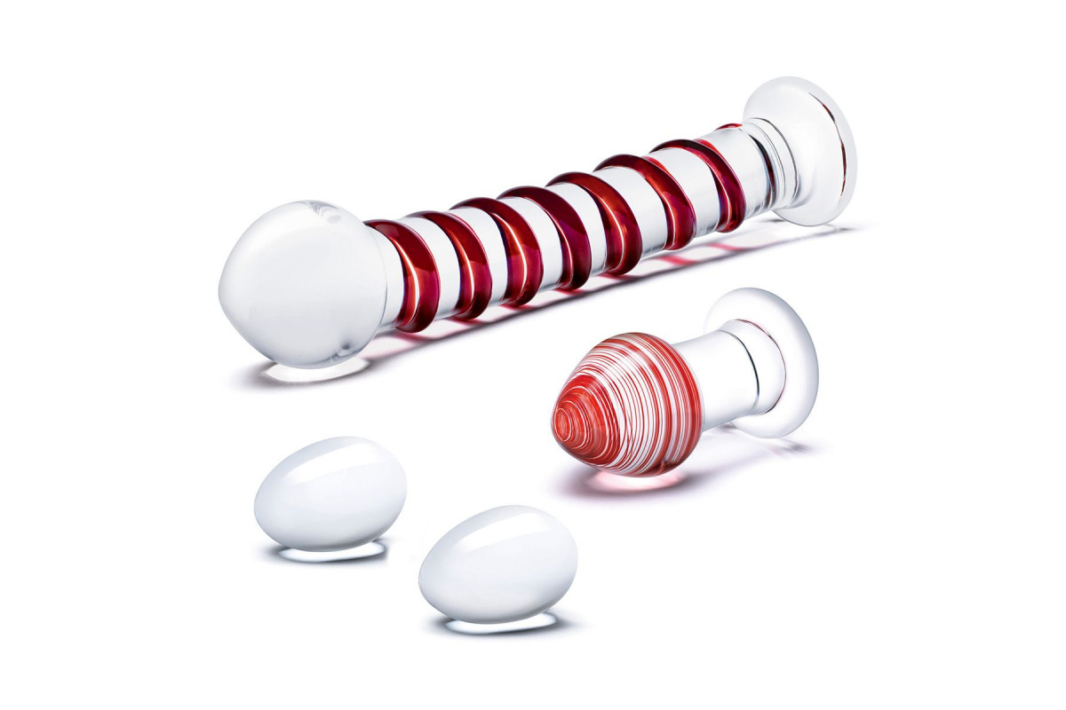 В наборе вы найдете стеклянные яйца йони, удобную небольшую анальную пробку, а также красивый прозрачный фаллоимитатор, поверхность которого покрыта рельефной спиралью красного цвета, без мошонки. Угол наклона головки и ее достаточно широкий диаметр позволяет воздействовать на точку G.