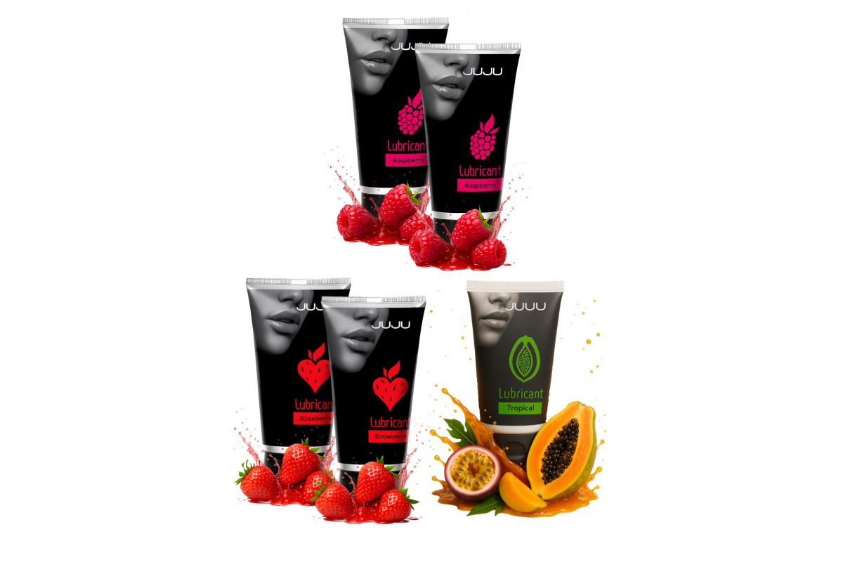 Набор из 5 съедобных лубрикантов JUJU (клубника х 2, малина х 2, тропические фрукты)