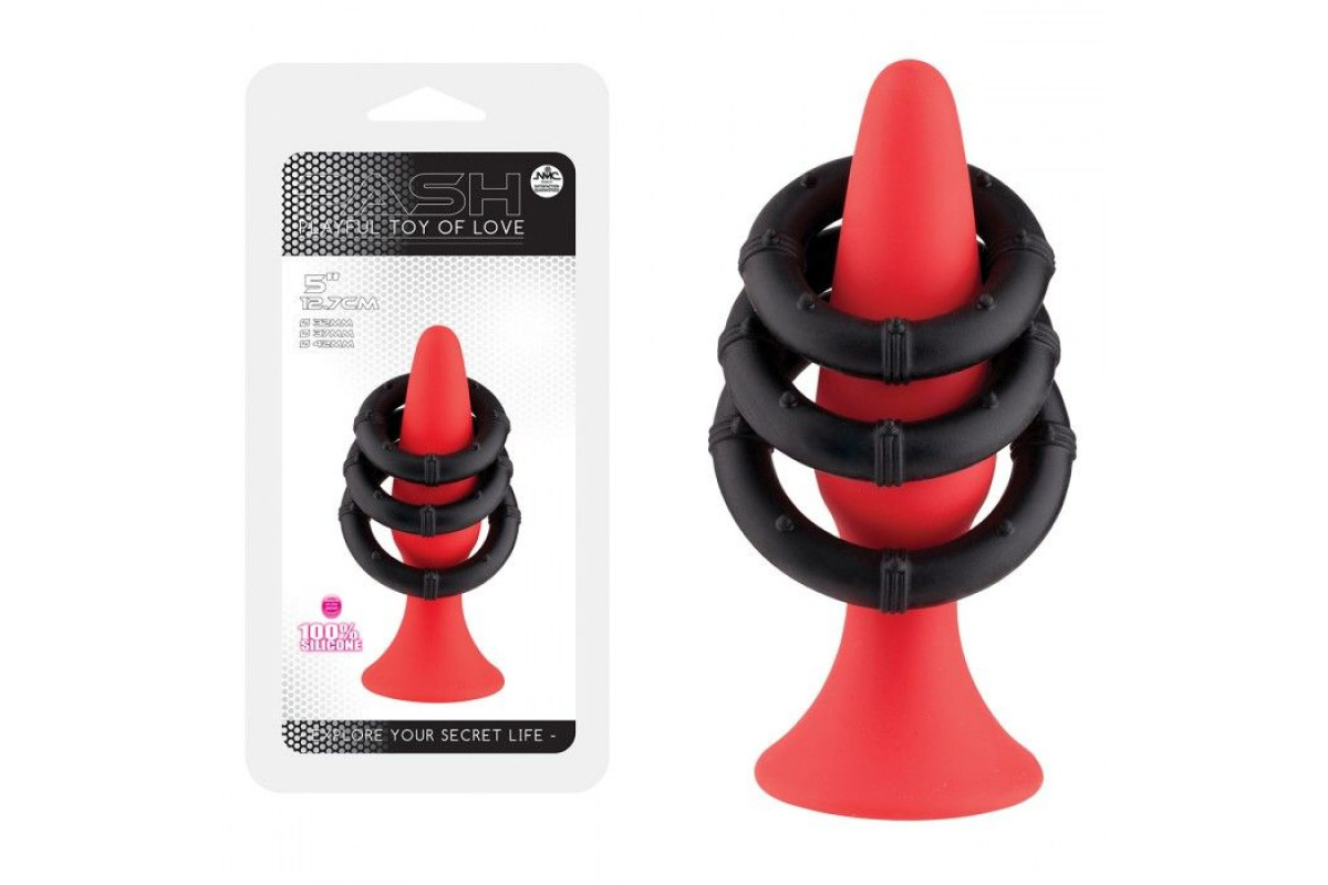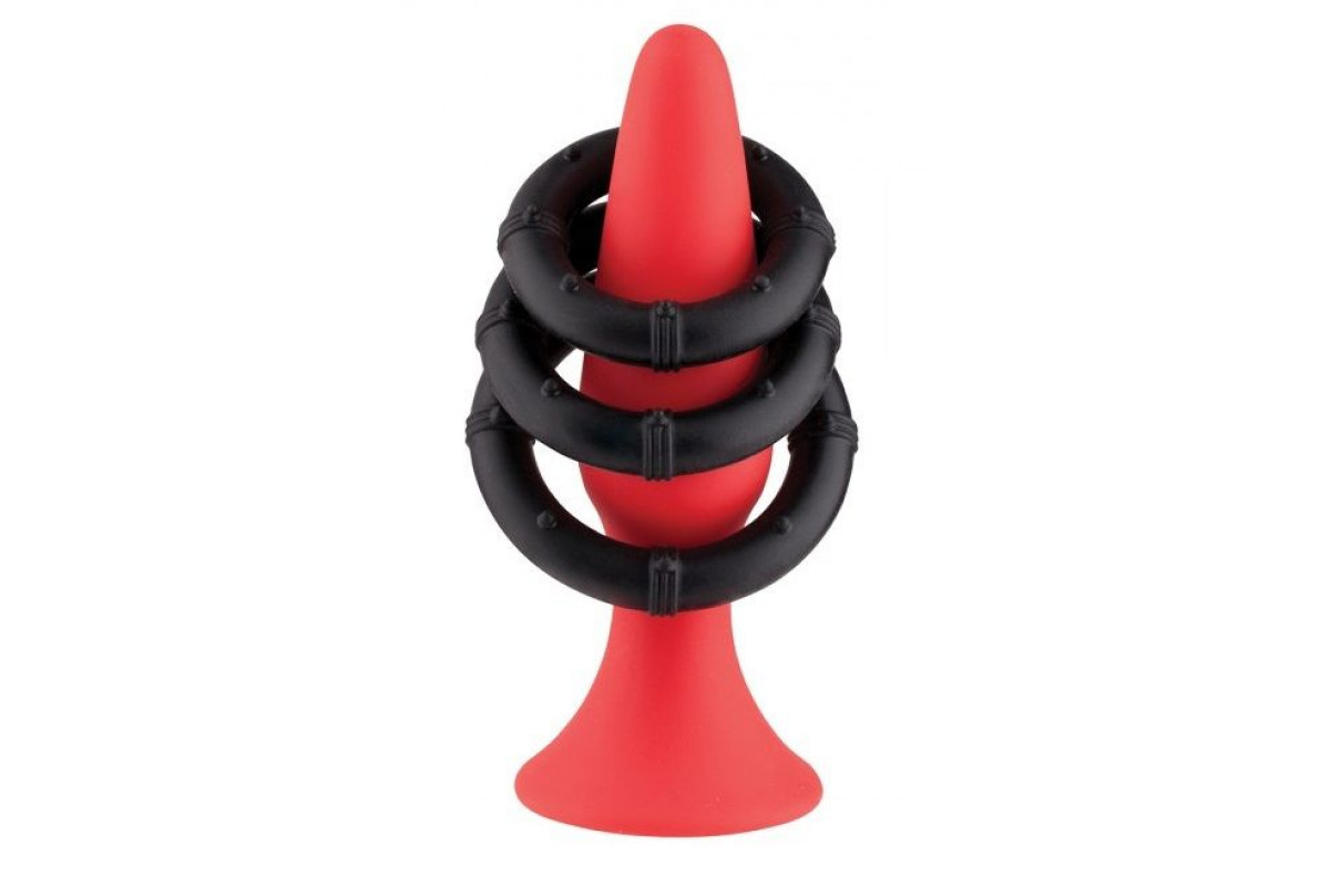 Красный плаг для анальной стимуляции из силикона. В наборе 3 черных силиконовых кольца, которые можно использовать на пенисе и мошонке. Диаметр колец - 3, 3,5 и 4 см.