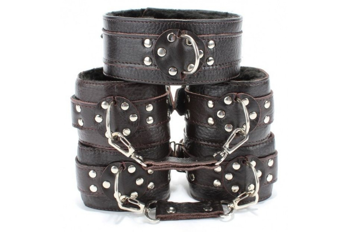 Набор коричневых фиксаторов: наручники с мехом, наножники и ошейник