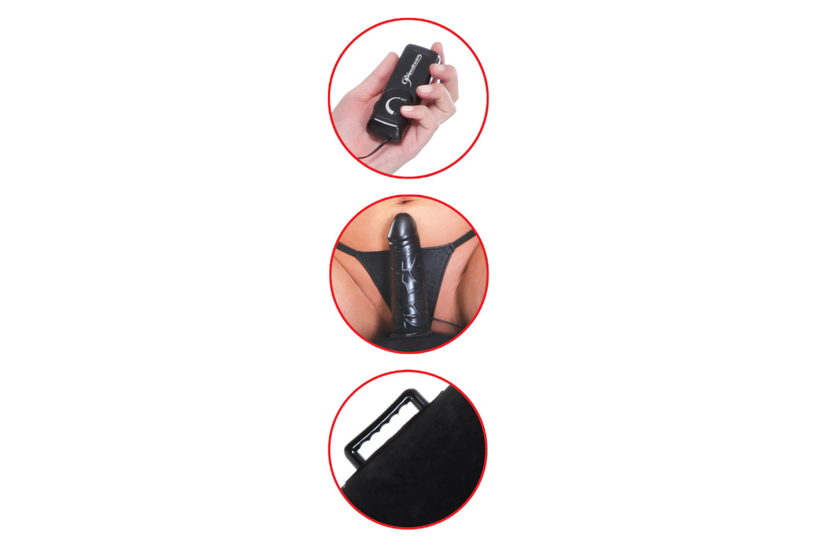 Надувная виниловая подушка обтянутая плюшевой флокированной тканью, имеет твердый вибрирующий фаллос, который устанавливается сверху. Оснащена удобными ручками-держателями. Имеет удобную выемку - седло, позволяющее держаться за ручки-рычаги и наслаждаться дикой ездой, которую вы контролируете!