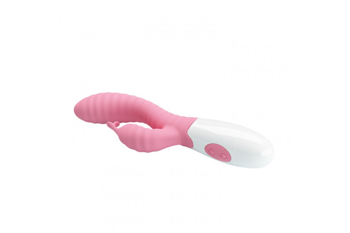 Нежно-розовый вибратор с клиторальным отростком и ребрами Pete - 20 см.
