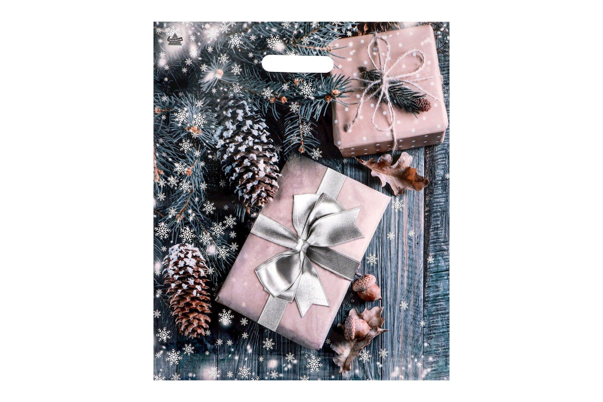 Новогодний пакет с принтом в виде подарков и вырубной ручкой (45х38 см)