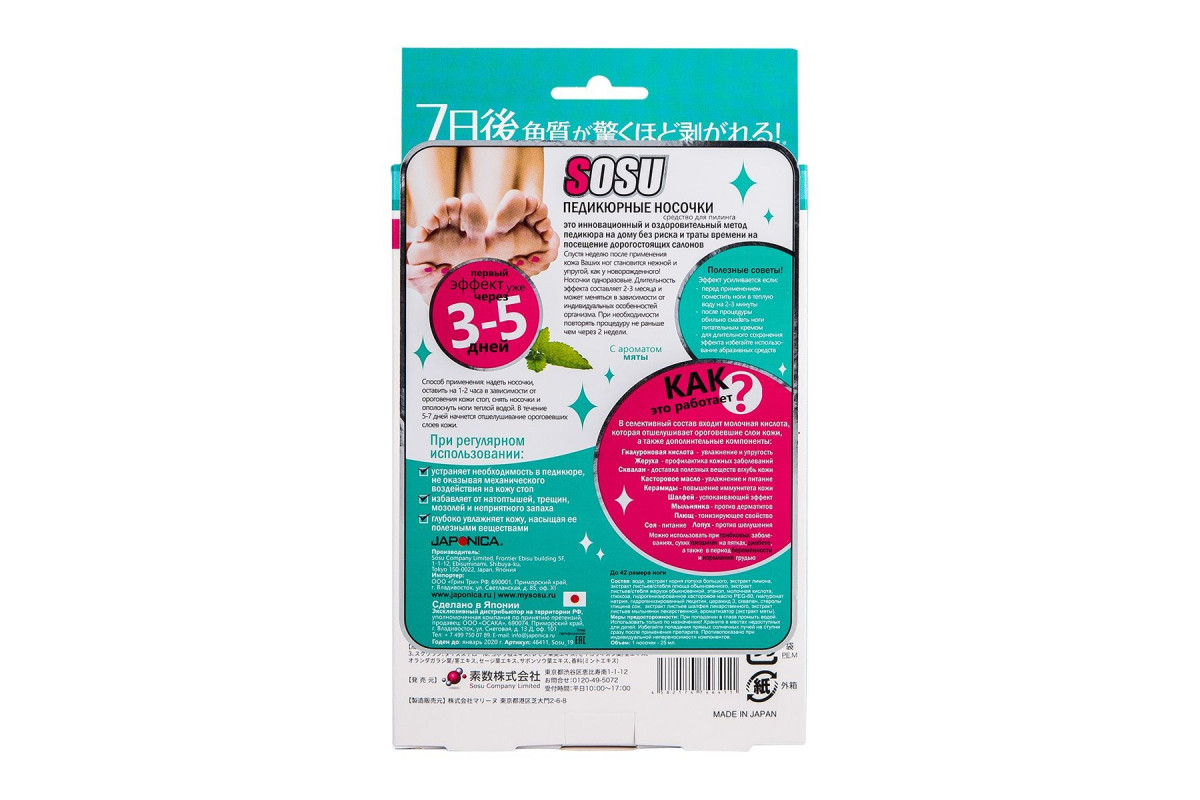 - Инструкция: Способ применения: 1.Срежьте верхнюю часть пакета, достаньте носочки. Будьте осторожны – не разлейте жидкость, которая находится внутри носочков. 2.Наденьте на стопы носочки, закрепите на ноге с помощью стикеров для фиксации и оставьте на один час. 3.По истечении часа снимите носочки и помойте ноги в теплой воде. 4.В течение 5-7 дней произойдет отшелушивание верхних плотных слоев кожи. 5.Способ и время отшелушивания кожи могут меняться в зависимости от личных особенностей человека.