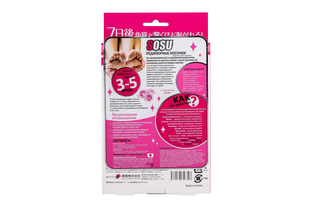 - Инструкция: Способ применения: 1.Срежьте верхнюю часть пакета, достаньте носочки. Будьте осторожны – не разлейте жидкость, которая находится внутри носочков. 2.Наденьте на стопы носочки, закрепите на ноге с помощью стикеров для фиксации и оставьте на один час. 3.По истечении часа снимите носочки и помойте ноги в теплой воде. 4.В течение 5-7 дней произойдет отшелушивание верхних плотных слоев кожи. 5.Способ и время отшелушивания кожи могут меняться в зависимости от личных особенностей человека.