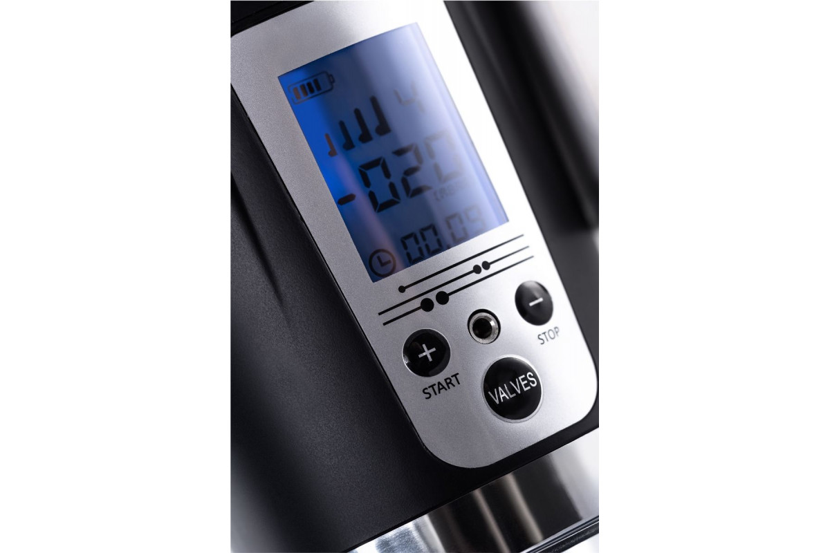 Повышение уровней: коротким нажатием на кнопку «+» последовательно повышайте уровни откачки воздуха. На экране в режиме реального времени отображается давление в колбе в Mbar. Помпа останавливается на заданном уровне и поддерживает указанный индикатором уровень давления. Если вы сбросите давление кнопкой «VALVES», помпа автоматически откачает воздух до заданного уровня.