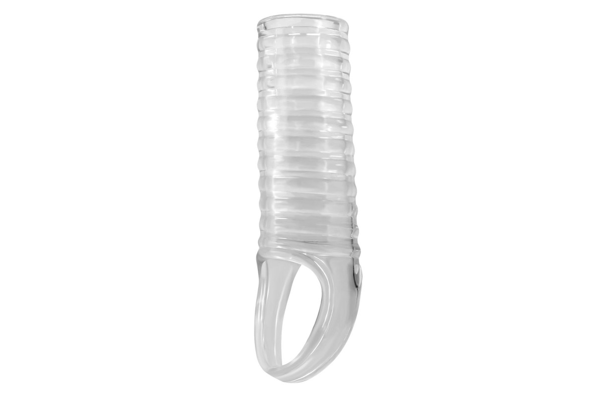 Прозрачная насадка на пенис с ребрышками и подхватом мошонки