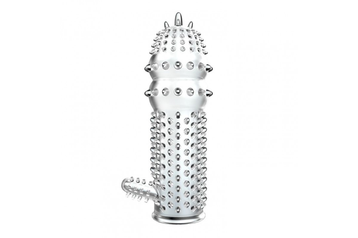 Прозрачная насадка на пенис с шипами и стимулятором клитора — 12,8 см
